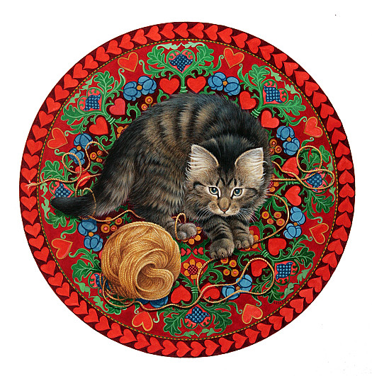 Lesley Anne Ivory has gained her reputation as the world’s most popular painter of cats by sustaining a superlative level of invention and craftsmanship. She studied at the art schools of St Albans, Watford and Luton, and, having gained the National Diploma in Design, taught at a school in Bedfordshire. Over a decade, she exhibited wood-engravings of wildlife at the Royal Academy, while creating an increasing demand for her card designs. Now married to the artist Evan Ivory and living in Hertfordshire, she works as a freelance designer and illustrator. As an illustrator, she has published many books, including Cats Know Best (1988), Meet My Cats (1989), Cats in the Sun (1991), Cats Among the Toys (1993) and Star Cats (1998). Never complacent, despite her secure position, she continues to test and stretch herself, both technically and conceptually, advancing by way of a balance between the observing eye and the designing hand. Though she is patently fascinated by the appearance and behaviour of cats, and studies their individuality with constant and precise attention, she is never content with providing a loosely delineated backdrop or with creating hastily sketched verisimilitude. She always thinks in terms of a complete pictorial design, drawing on her impressive knowledge of the history of design in order to extend her own visual language.