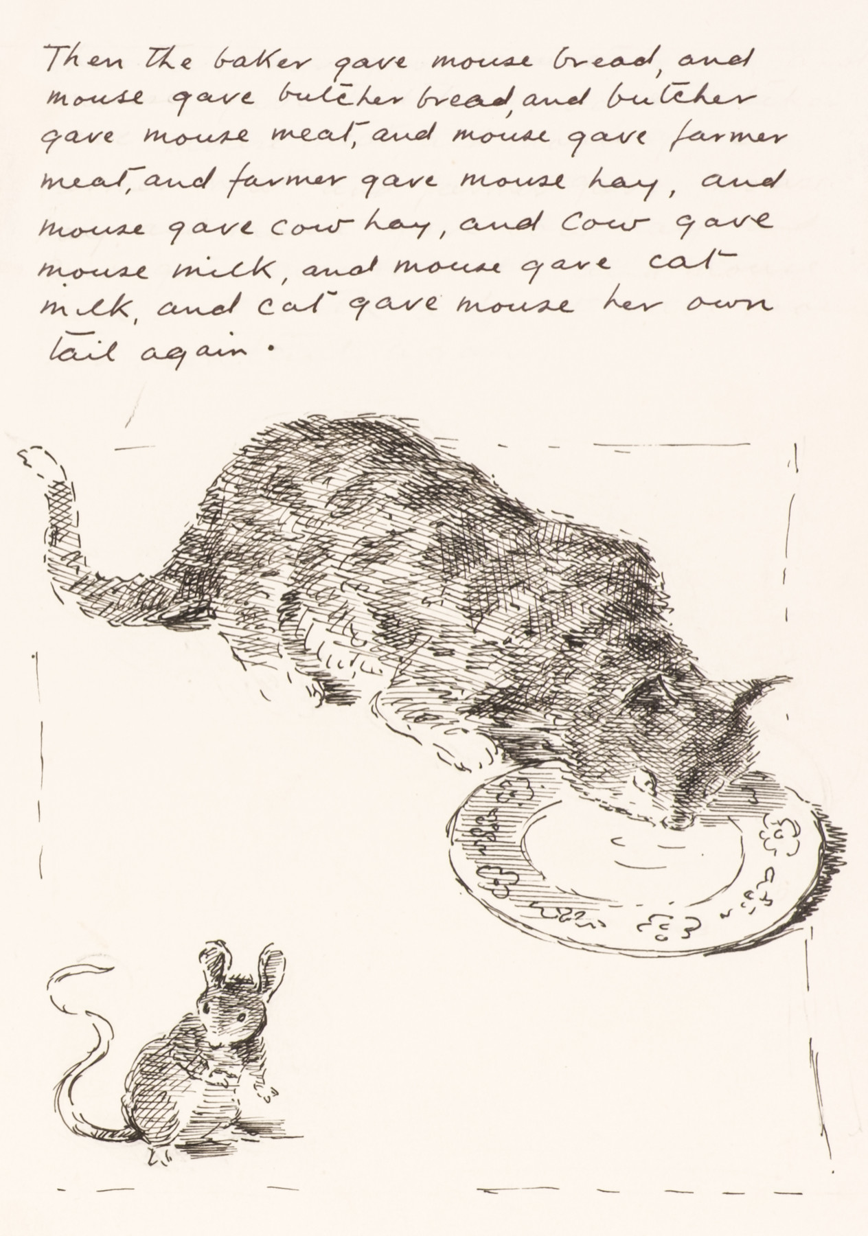 Then the baker gave the mouse bread, and mouse gave the butcher bread, and butcher gave mouse meat, and mouse gave farmer meat, and farmer gave mouse hay, and mouse gave cow hay, and cow gave mouse milk, and mouse gave cat milk, and cat gave mouse her own tail again.