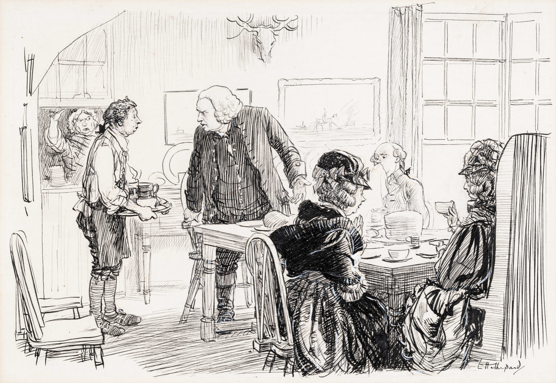 "In Beetles' catalogue this illustration bears the caption, 'The Mutton was bad', but in Everybody's Boswell the illustration (opposite page 414) has the caption 'He scolded the waiter,' a direct quotation from Boswell's text on this page. Shepard first wrote on the reverse of the illustration 'Scolded the waiter,' but crossed it out and underneath wrote 'The mutton was bad', perhaps thinking this would be more eye catching. However, Bell & Son the publishers obviously picked this up and in the book gave it the caption taken from the text thus conforming to Shepard's usual practice of choosing one from the text, which he would then illustrate. The reason Johnson had scolded at the waiter was because he considered the mutton 'ill-fed, ill-killed, ill-kept, and ill-dressed. It would appear that it was indeed bad!"