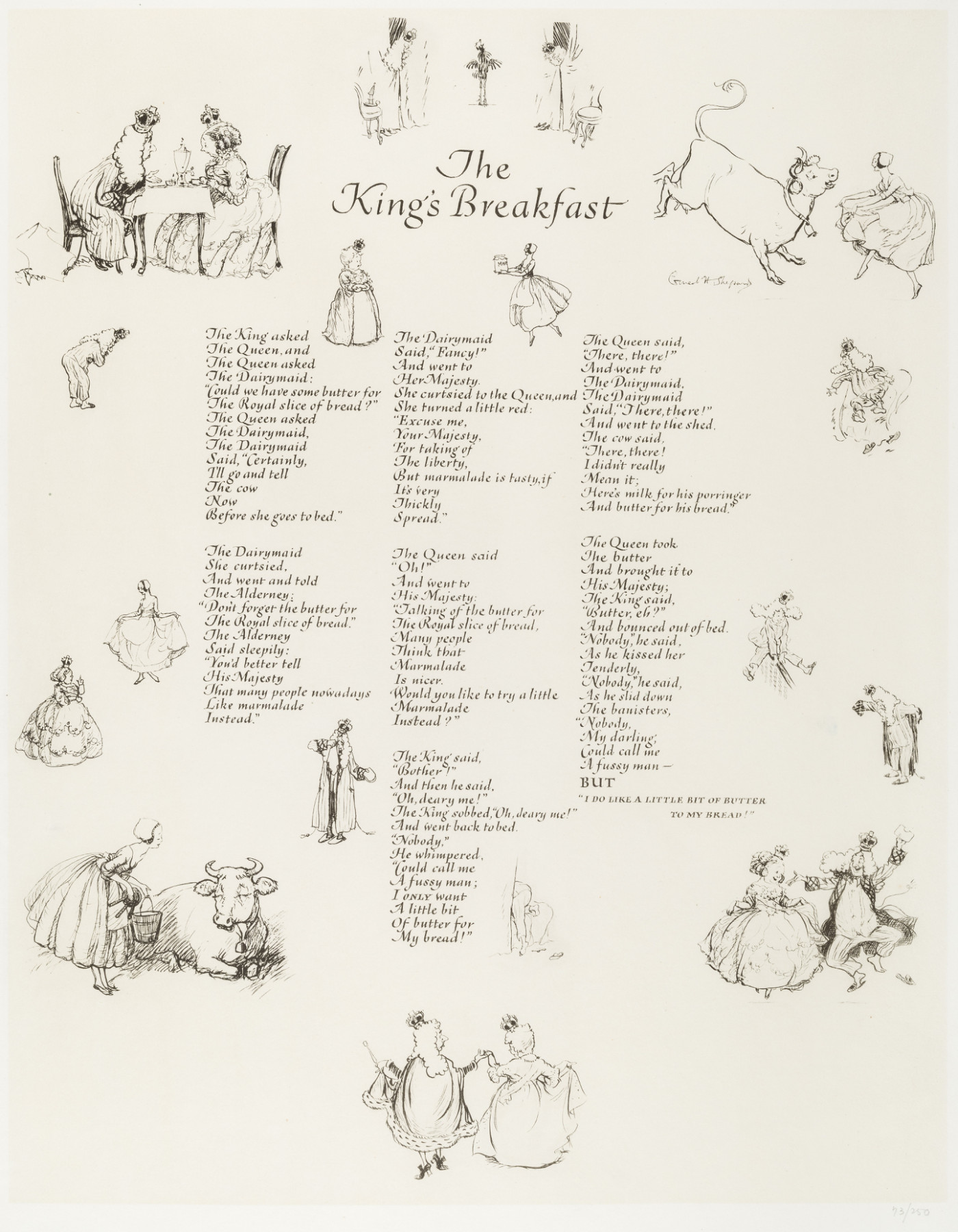 Part of a portfolio set of 6 lithographs on mould-made paper published by Methuen & Co, London, in 1924 of verses from When We Were Very Young by A.A.Milne. A limited edition of 250 sets, of which these are set No 73, the lithographs are of the original drawings done by Shepard surrounding Milne's verses, which are written in fine calligraphy.