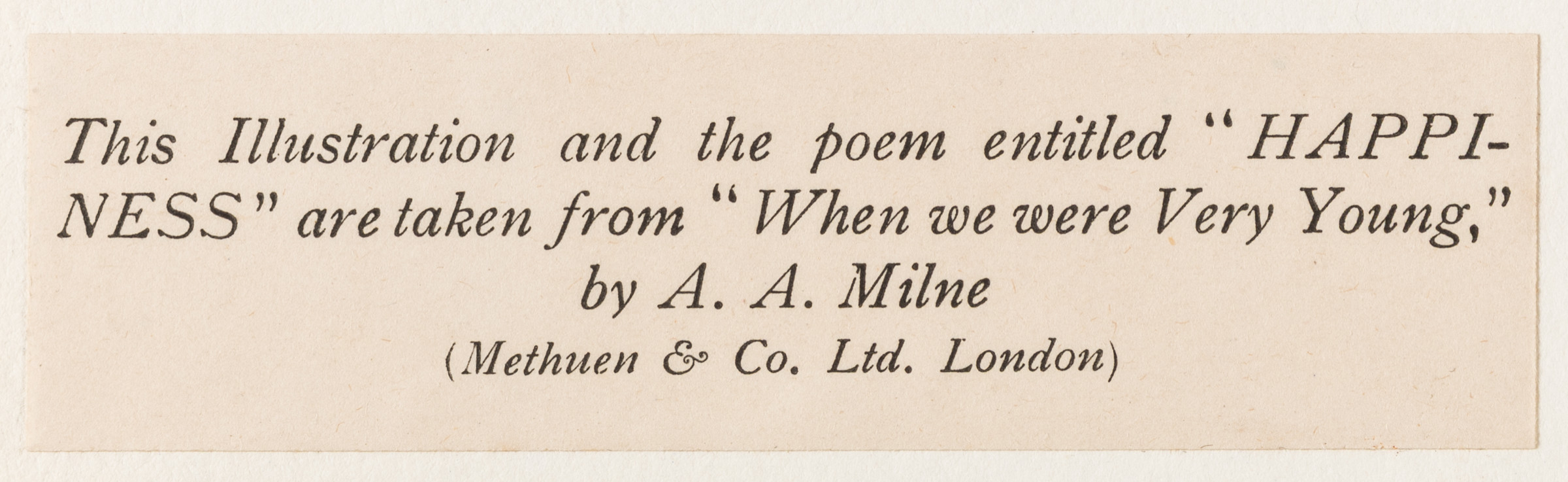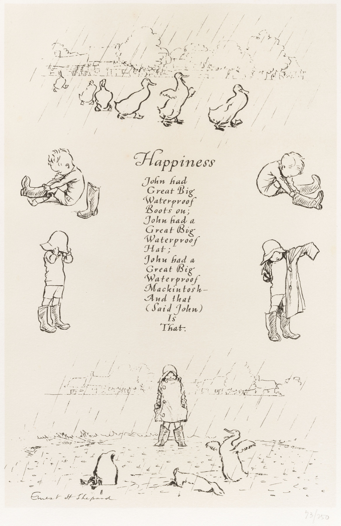 Part of a portfolio set of 6 lithographs on mould-made paper published by Methuen & Co, London, in 1924 of verses from When We Were Very Young by A.A.Milne. A limited edition of 250 sets, of which these are set No 73, the lithographs are of the original drawings done by Shepard surrounding Milne's verses, which are written in fine calligraphy.
