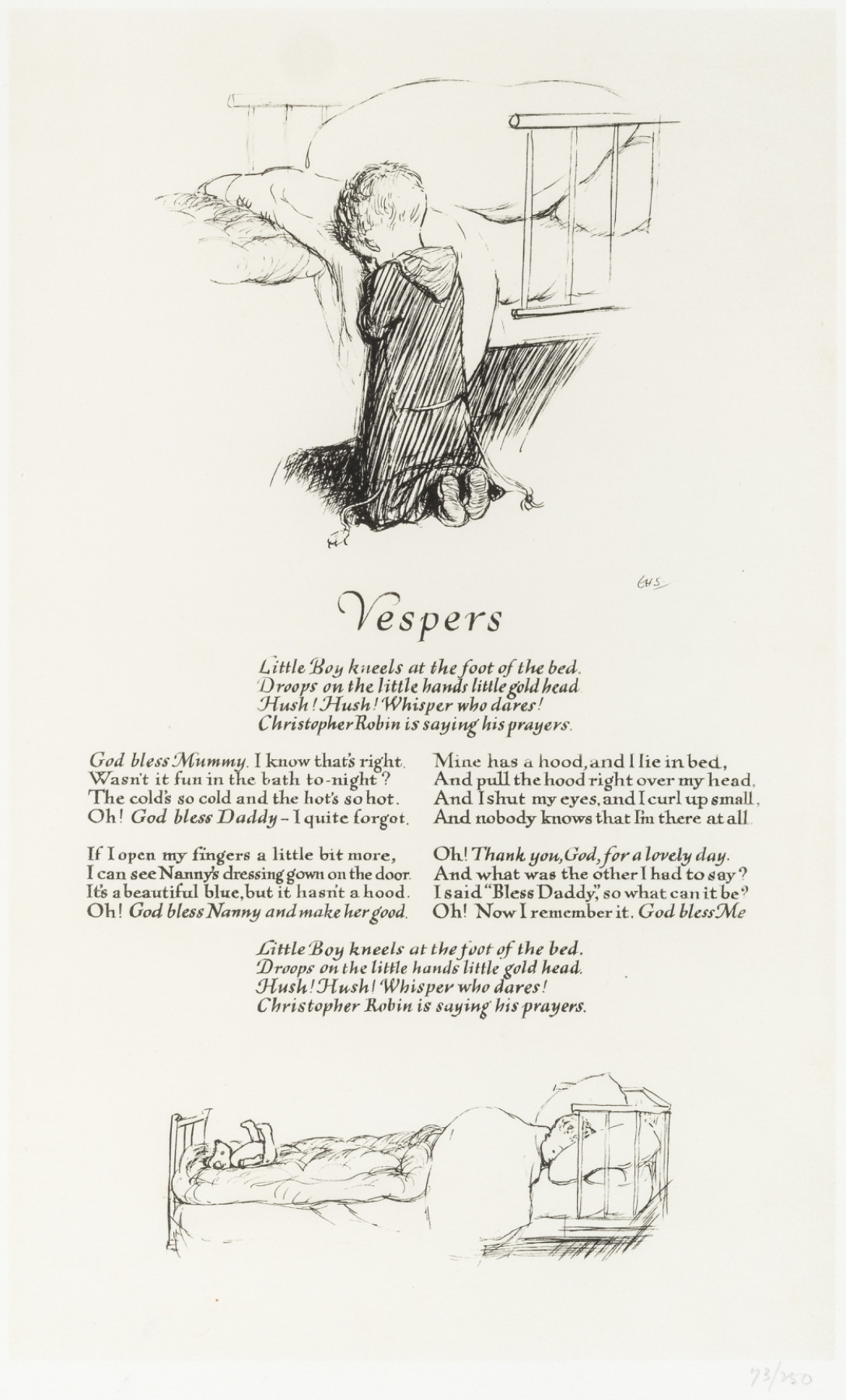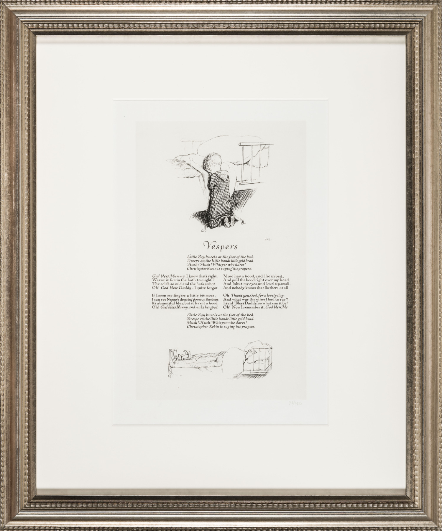 Part of a portfolio set of 6 lithographs on mould-made paper published by Methuen & Co, London, in 1924 of verses from When We Were Very Young by A.A.Milne. A limited edition of 250 sets, of which these are set No 73, the lithographs are of the original drawings done by Shepard surrounding Milne's verses, which are written in fine calligraphy.