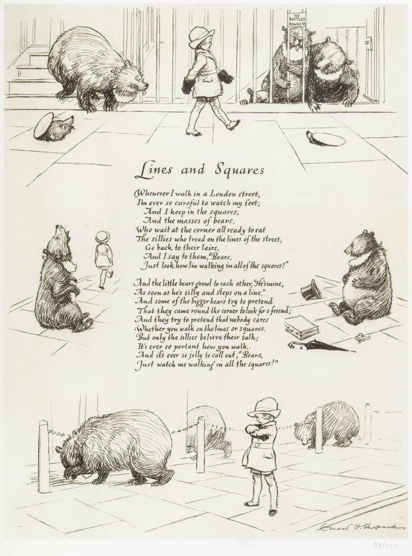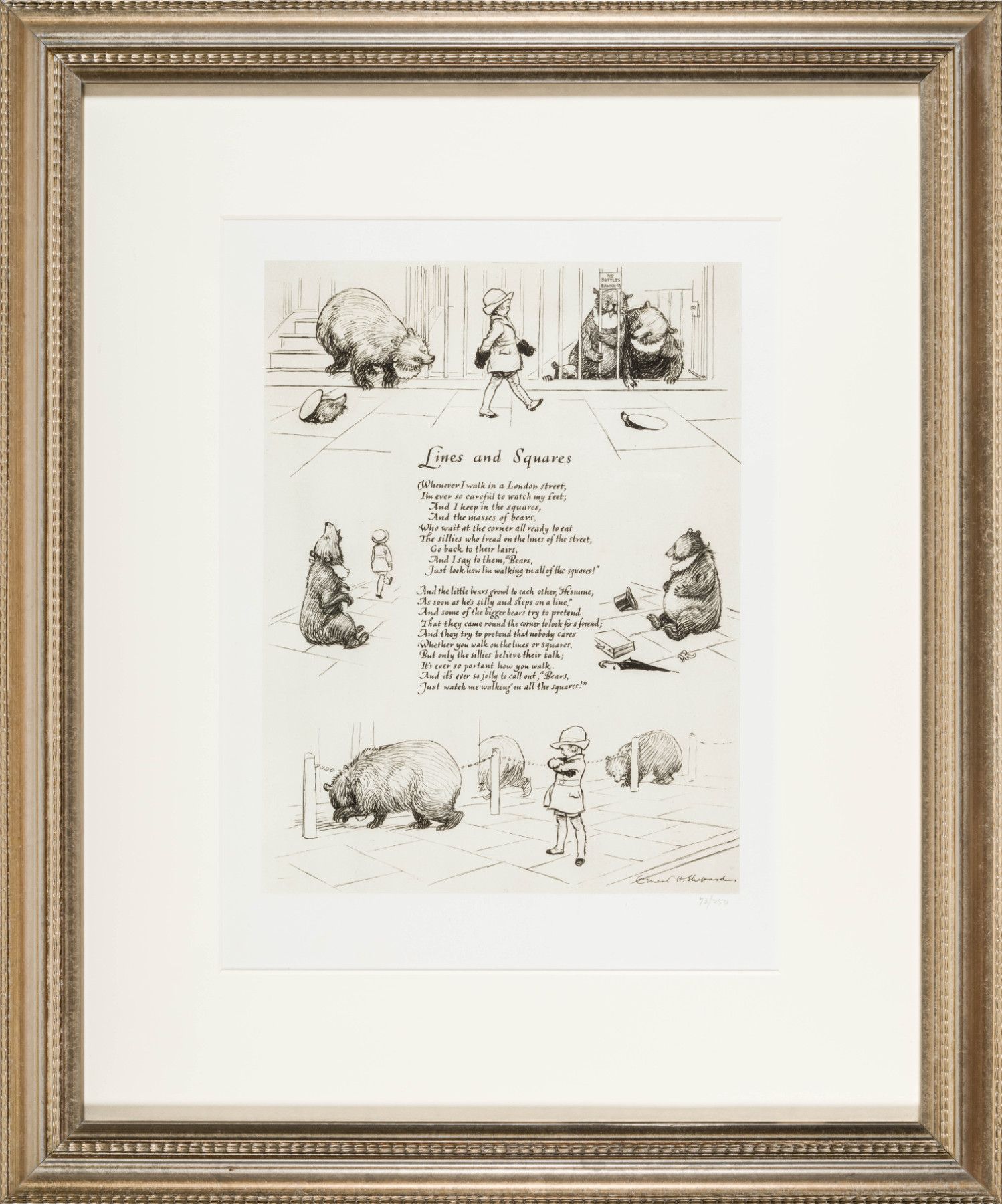 Part of a portfolio set of 6 lithographs on mould-made paper published by Methuen & Co, London, in 1924 of verses from When We Were Very Young by A.A.Milne. A limited edition of 250 sets, of which these are set No 73, the lithographs are of the original drawings done by Shepard surrounding Milne's verses, which are written in fine calligraphy.