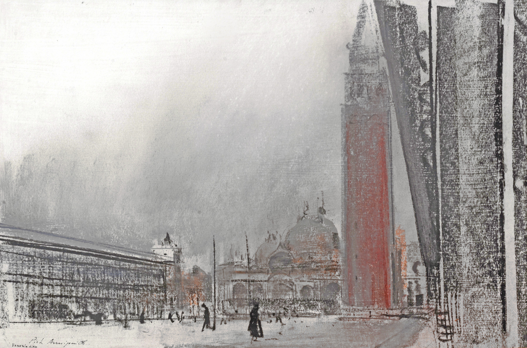Pietro Annigoni produced this drawing of Piazza San Marco, the principal public square of Venice, in 1970, near the close of what may be considered his London Period'. The viewpoint of the beautifully spare composition is probably that of the terrace of the Caffè Florian, which was founded in 1720, and is the oldest café in Italy in continuous operation.