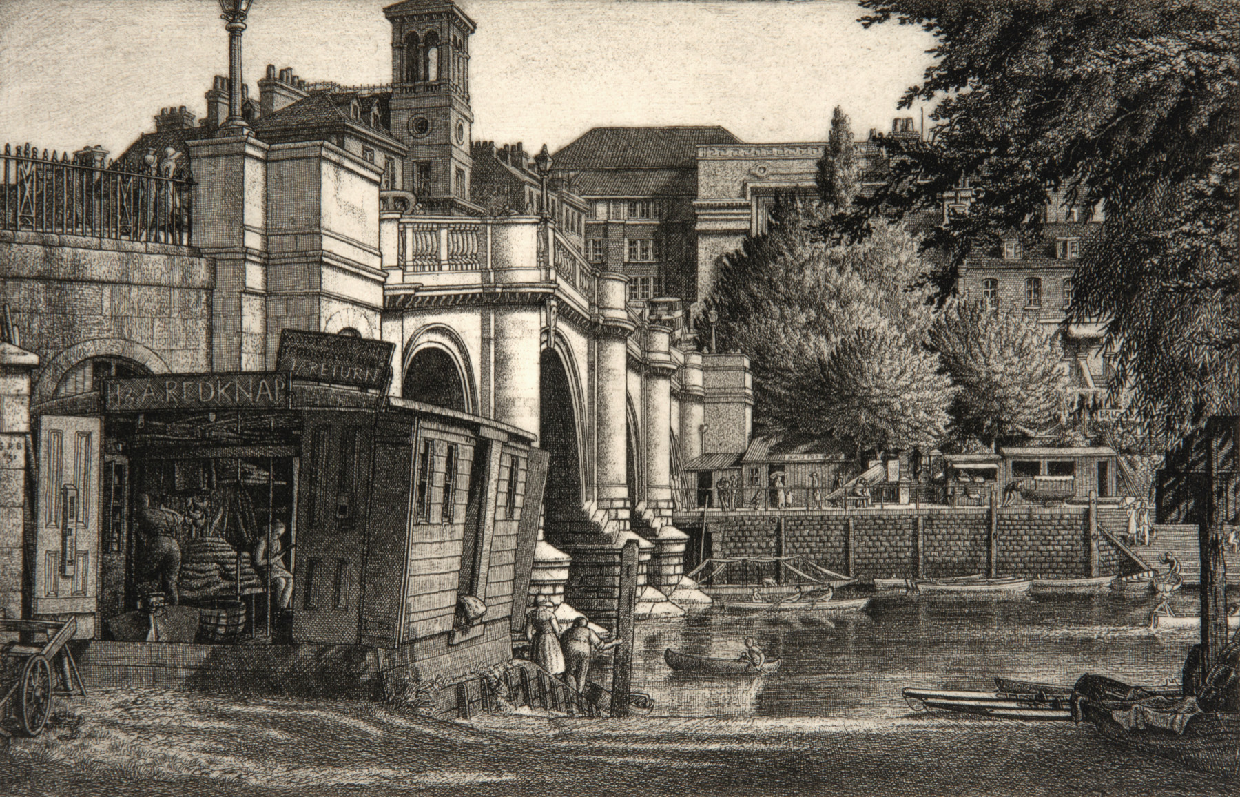 ‘S R Badmin, RWS, RE, ARCA, FSIA’, Worthing Art Gallery, November-December 1967, No 11, as 'Richmond Bridge Over the River Thames';