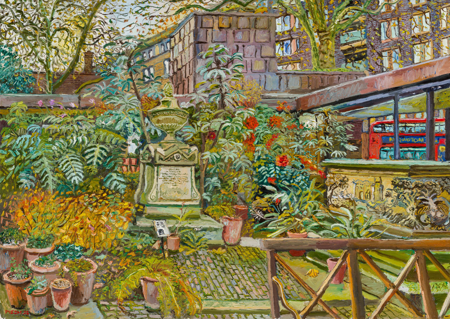 'My latest painting of the Garden Museum courtyard garden painted in a few sessions next to the lovely café. This is the second one I’ve done there, this one shows the very interesting tomb of the Tradescants and of Captain William Bligh.'