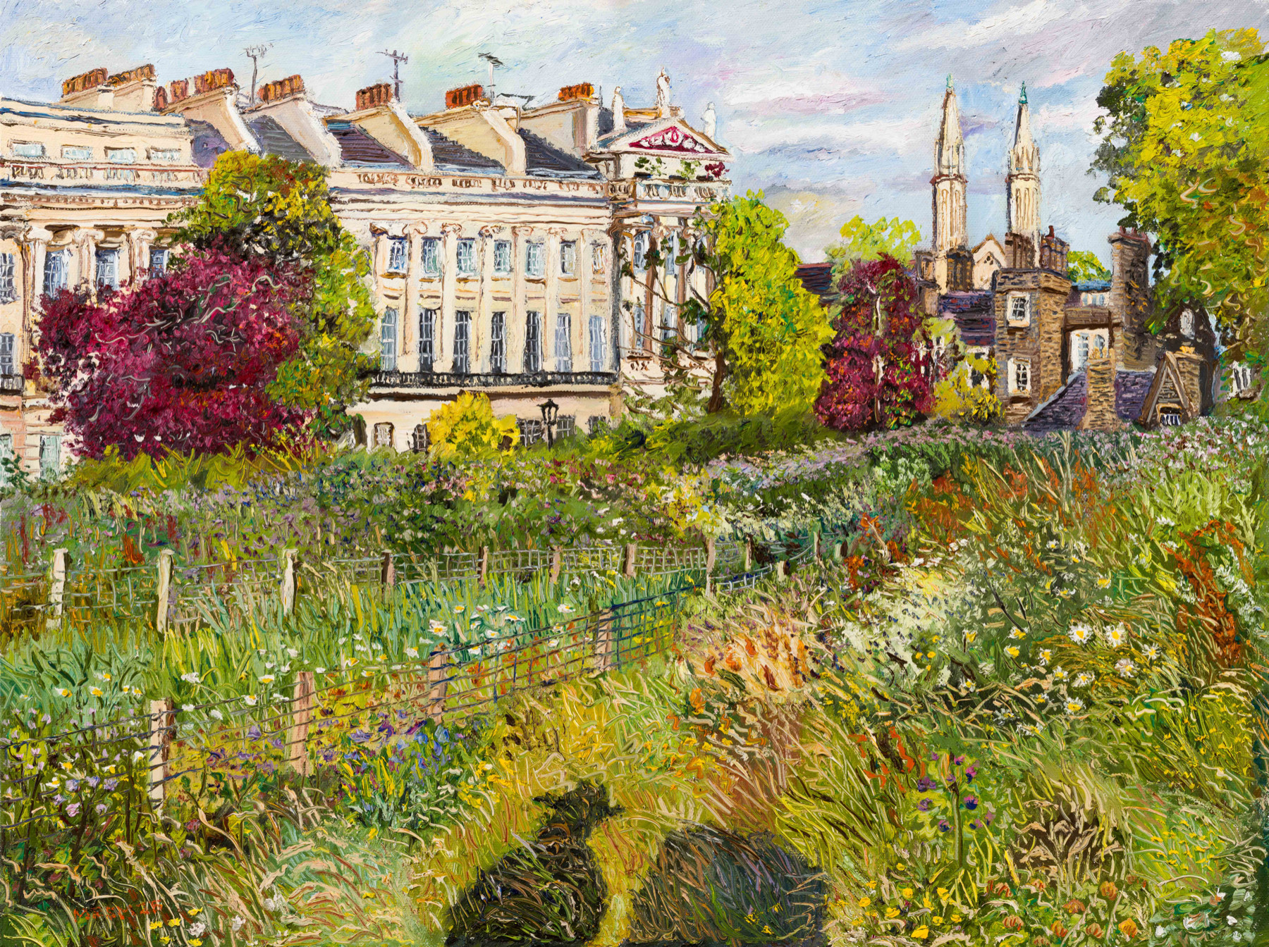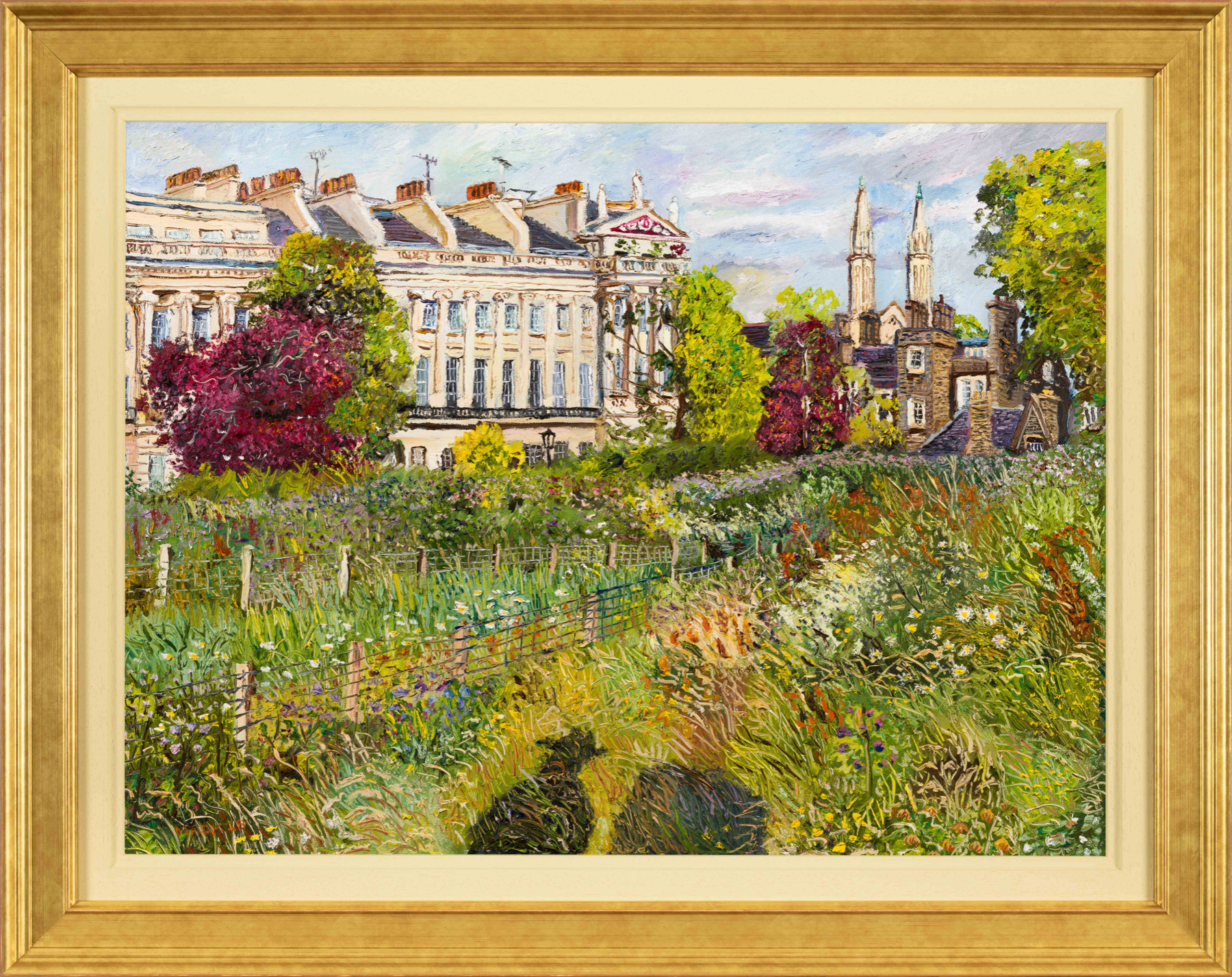 'Just finished my evening painting of Gloucester gate and St Katherines Danish Church in Regent's Park, amongst the wild flowers of 'the Swale'. I put my shadow in because I thought it looked so amazing. I painted over four evenings and was often watched by a big gang of kids who had been playing at the nearby playground and asked me lots of interesting questions like did I have kids? Did they live with me? Was I sad that they didn’t ...