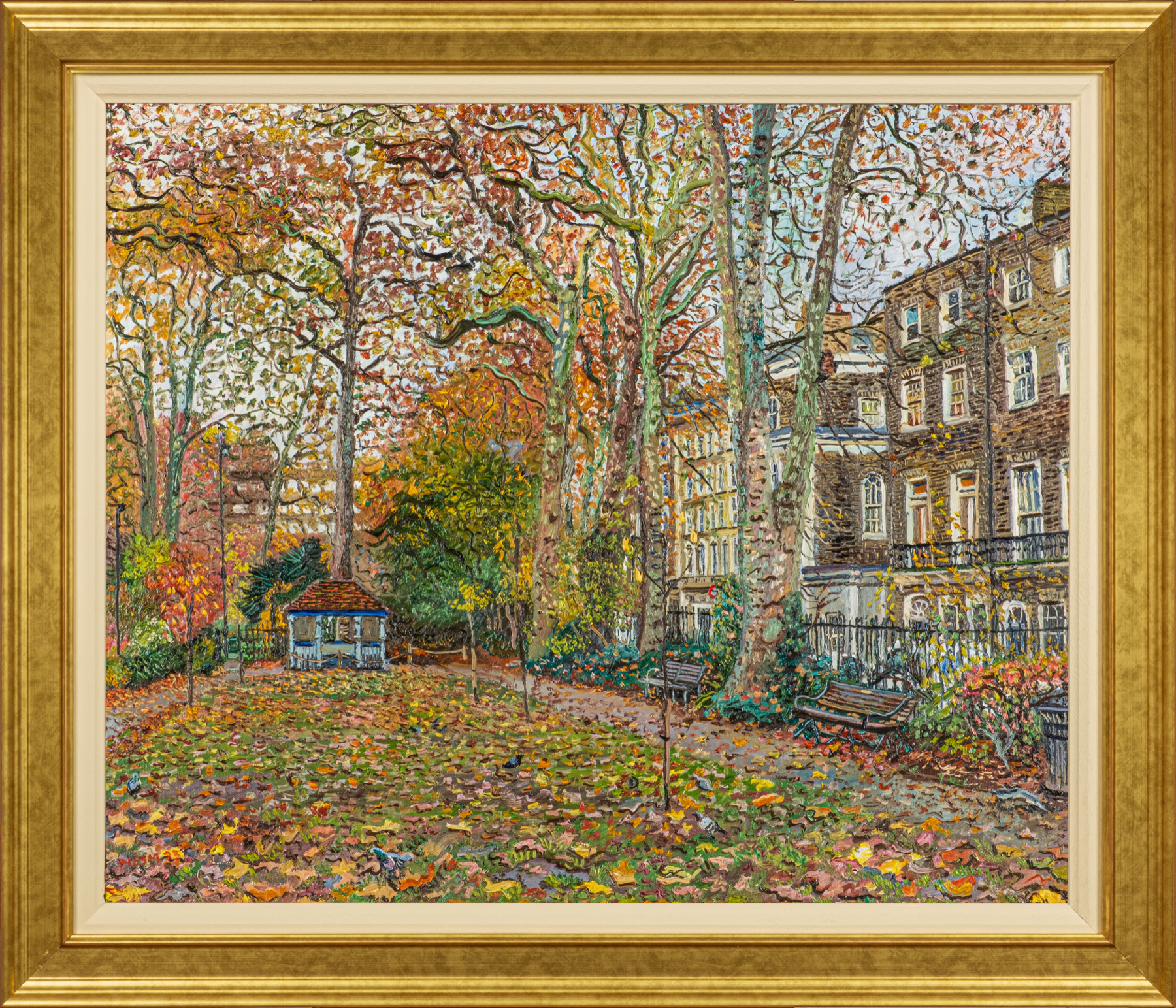 'I know this square really well because there's actually a part of the Slade there. When I was at the Slade a building was taken over by the Courtauld. For a time the whole collection of the Courtauld was in that building in Woburn Square. We used to go and see it all the time. I always remember that Noel Foster, he was an abstract artist and tutor, he said, “Would you like to come and show me your favourite painting in the collection?” I thought that was such a sweet thing. And his favourite was the Gaugin, I remember. Anyway, so I really like that square. I love the little hut. This was my first ever attempt to do a ground covered in autumn leaf. So I was really pleased with how it turned out.'