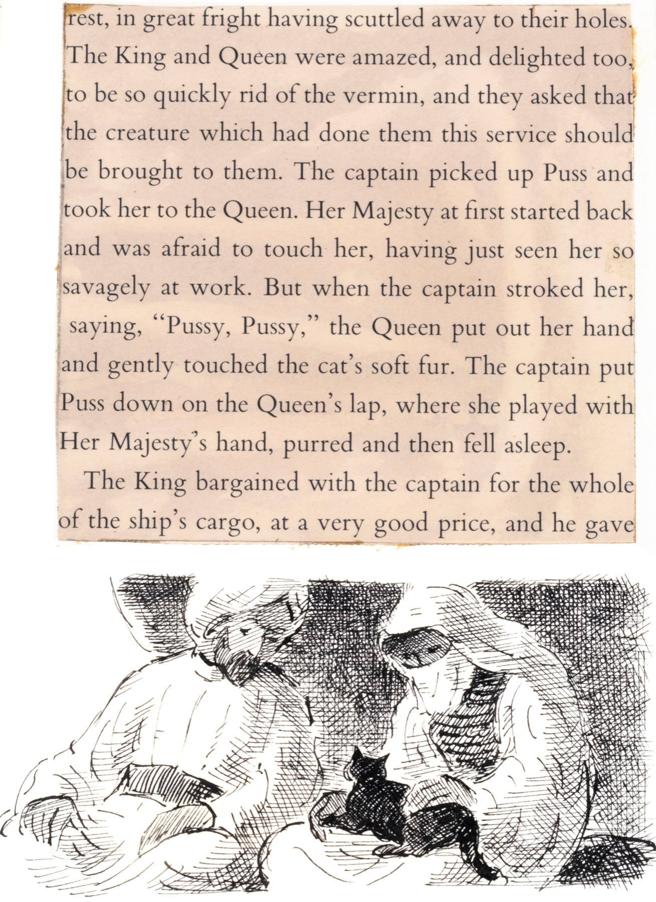 The captain picked up Puss and took her to the Queen
