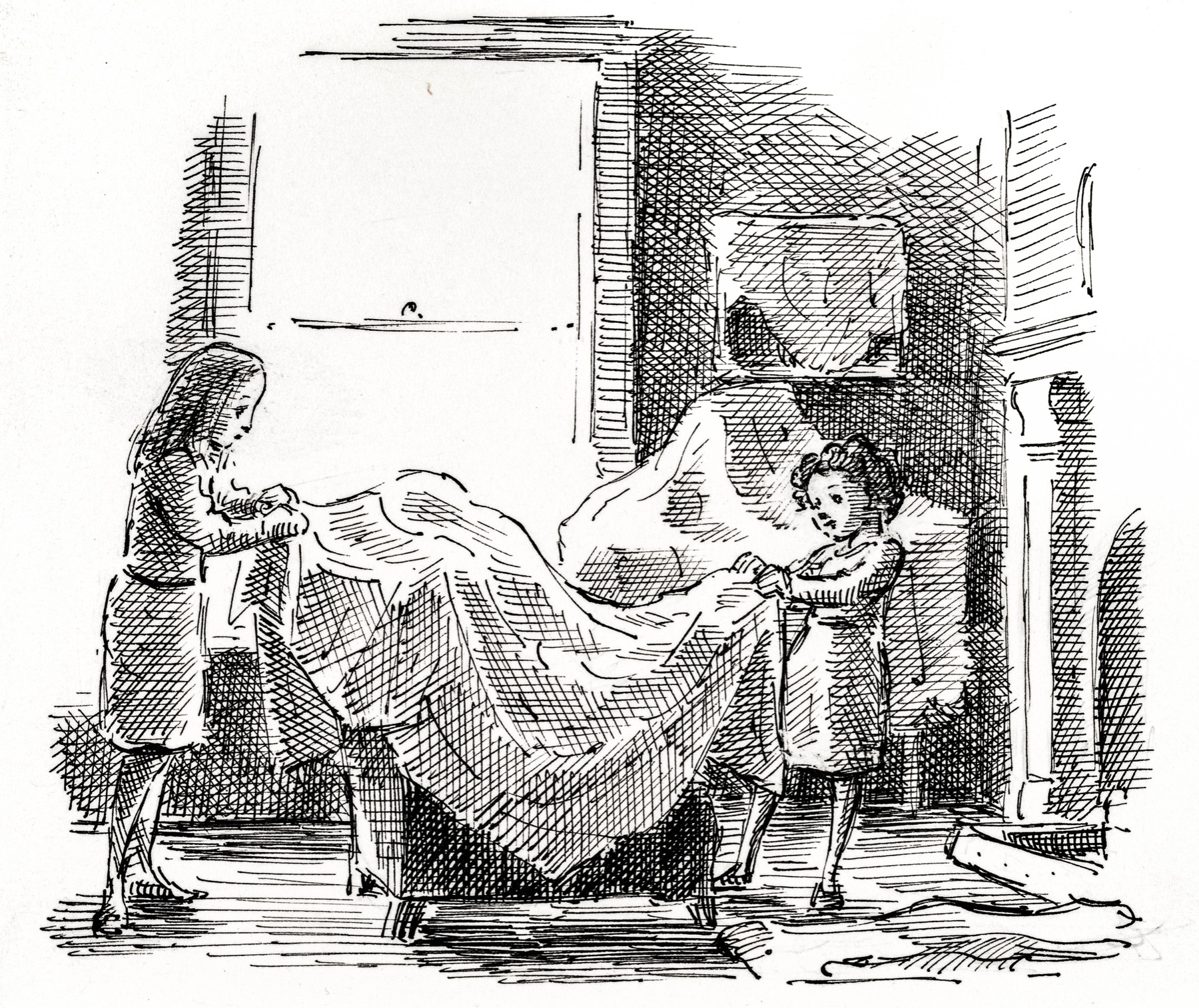 'Closing the house upstairs was quite a job. All the beds had to be stripped and the sheets and the pillow cases put in the laundry basket. Then every bit of furniture had to be covered in dust sheets, and small things wrapped in newspaper and all cupboards and drawers locked', page 39