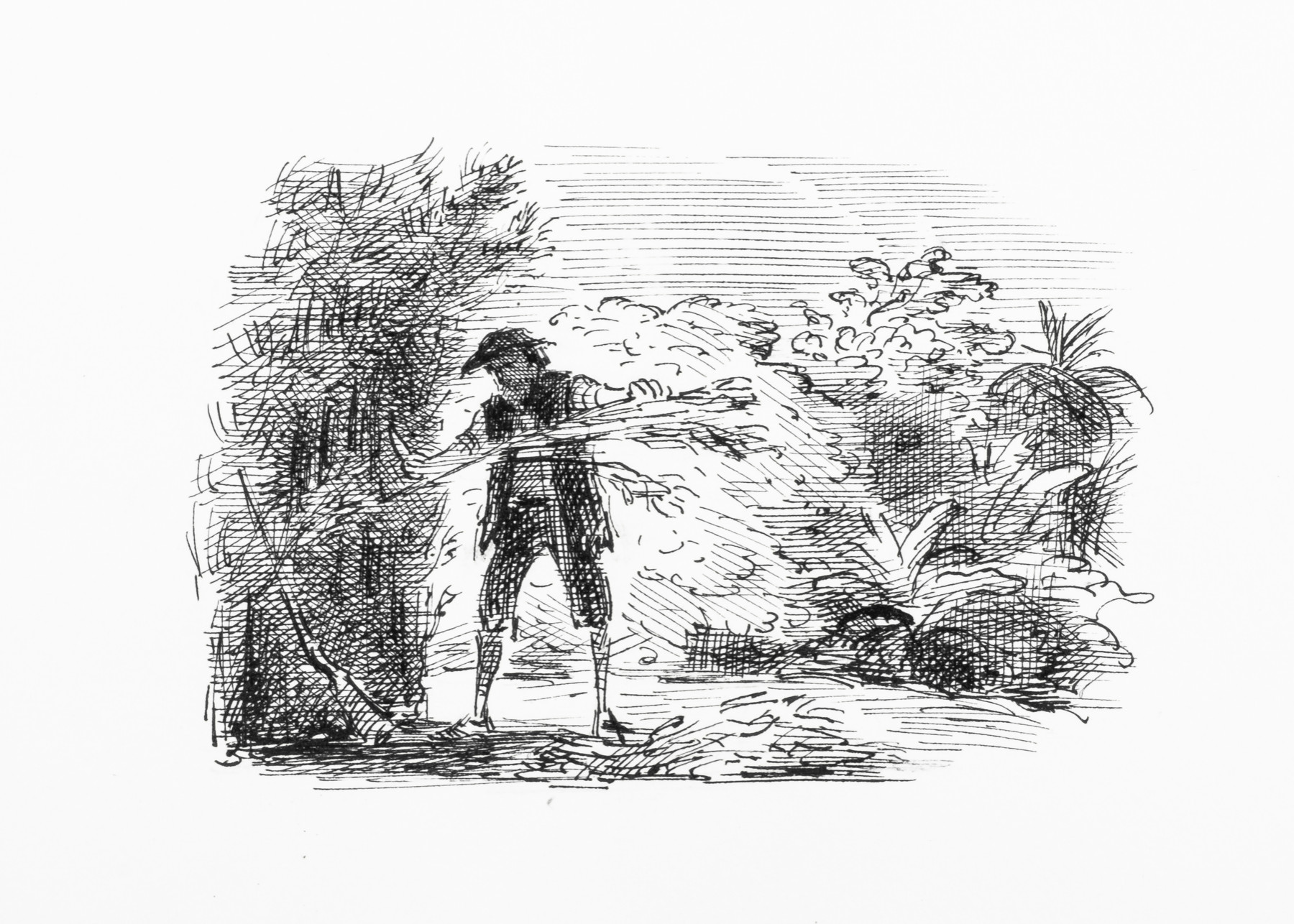 '…that I wanted nothing else than my materials; when it came into my mind that the twigs of that three from where I cut my stakes that grew might possibly be as tough as the swallows, and willows, and osiers in England…' page 115