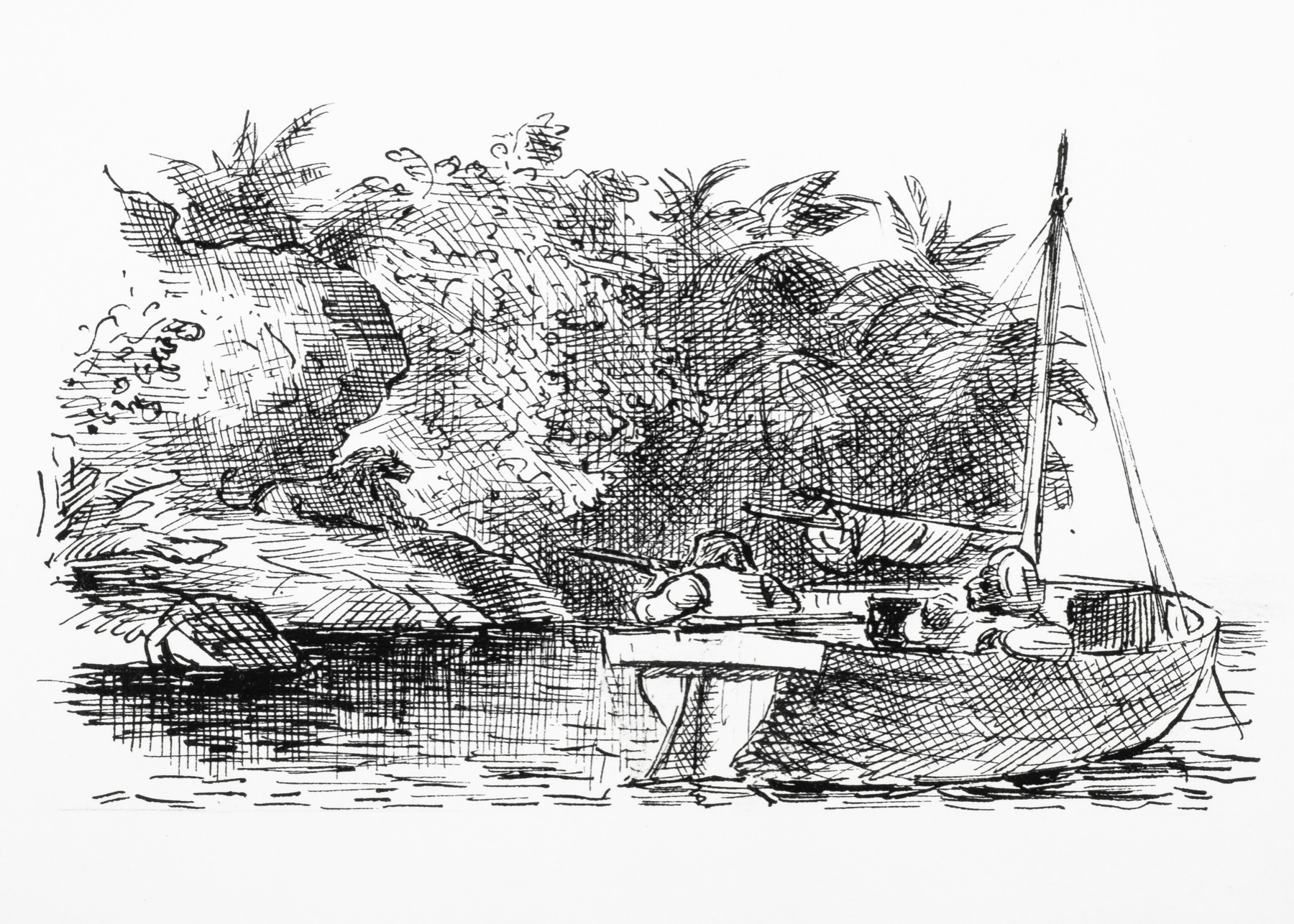 'I was forced in again by contrary winds, the sea also going too high for my little vessel; so, I resolved to pursue my first design, and keep along the shore.' page 40