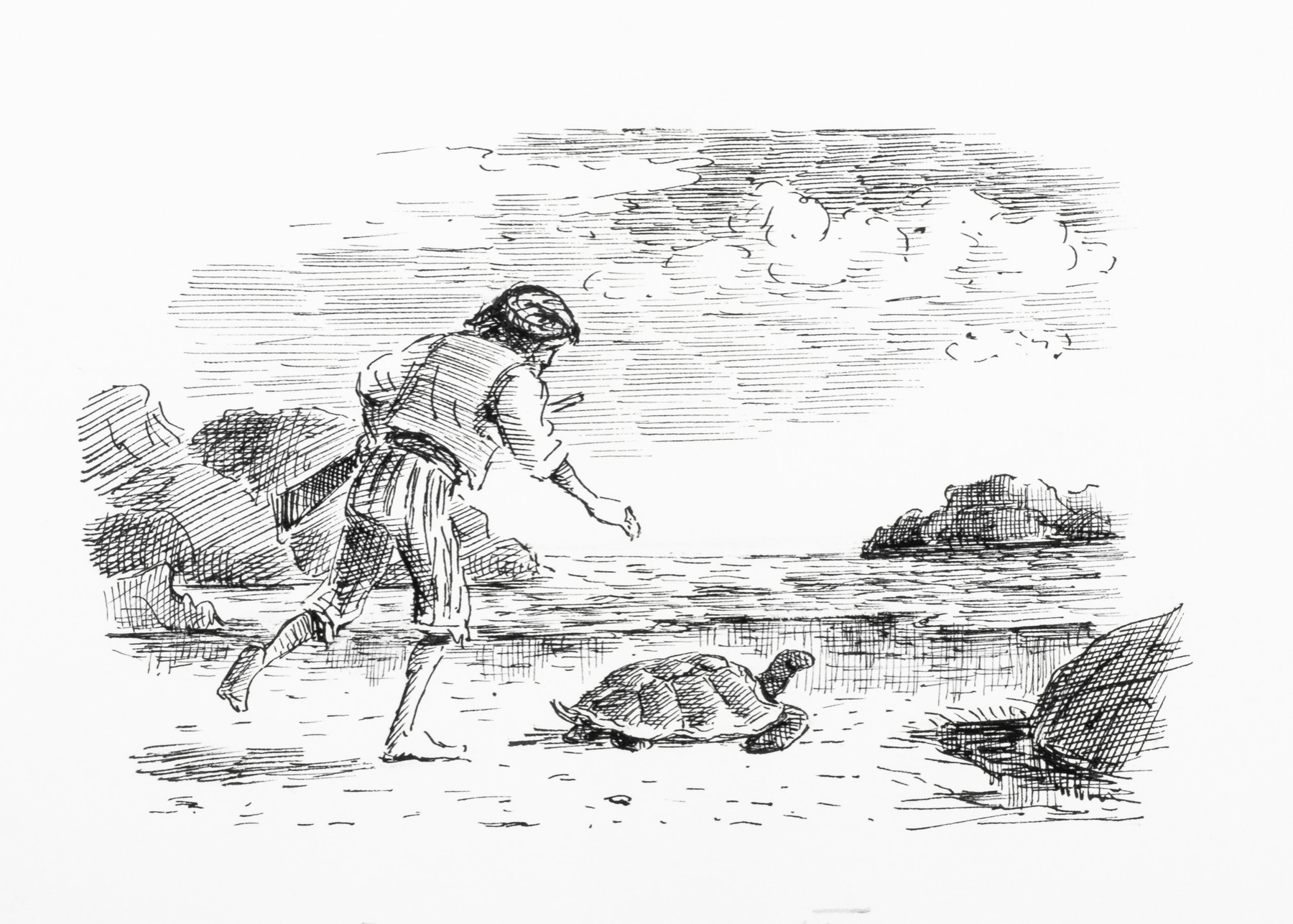'June 16 – Going down to the seaside I found a large tortoise, or turtle.' page 97