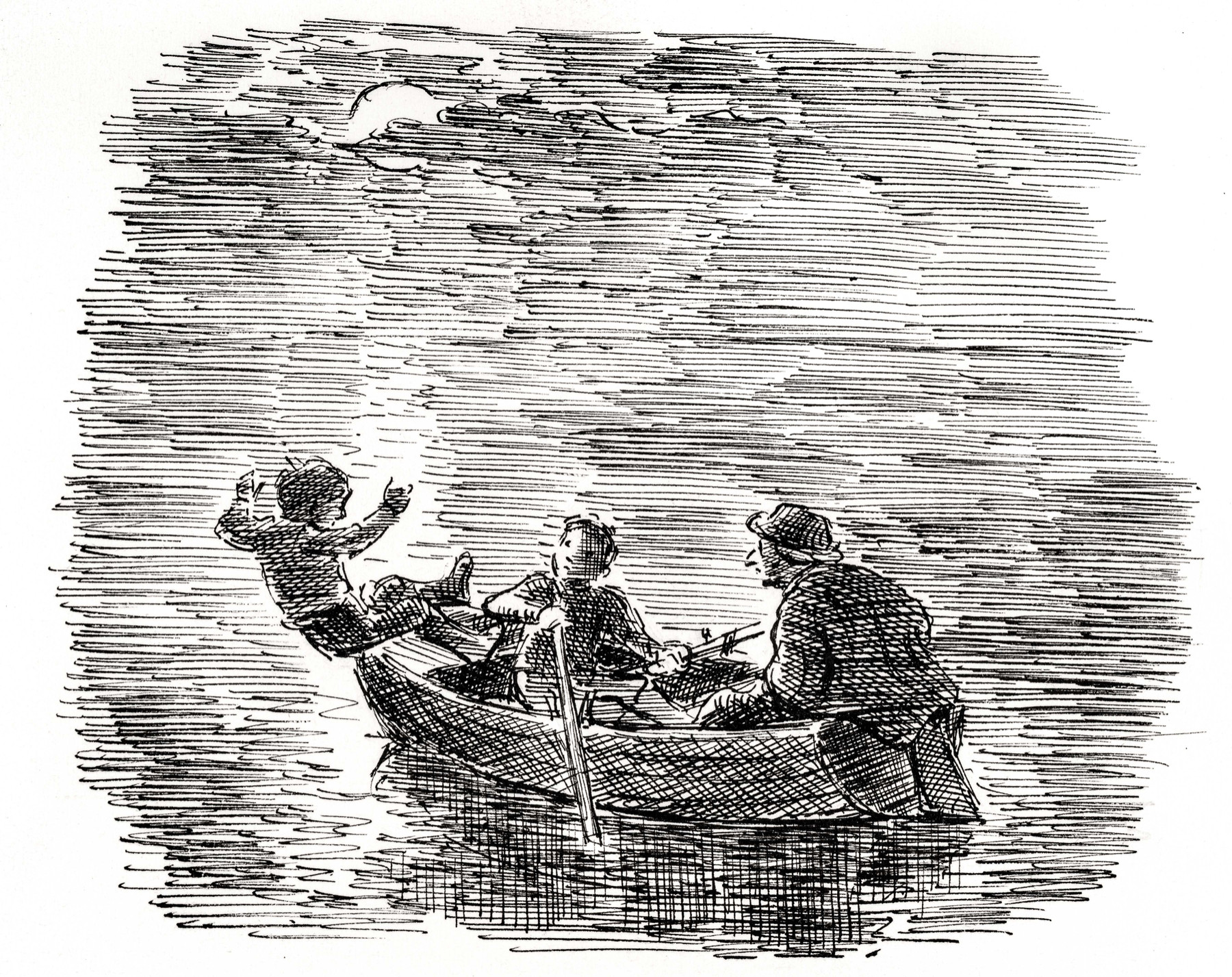 'Robin, knowing nothing of boats, stood up to move to the seat in front of Alex. Changing places in a boat is always a manœuvre that needs caution but particularly so when the one who rows is liable to catch a crab. This Alex, watching Robin, promptly did and so tipped Robin into the sea.