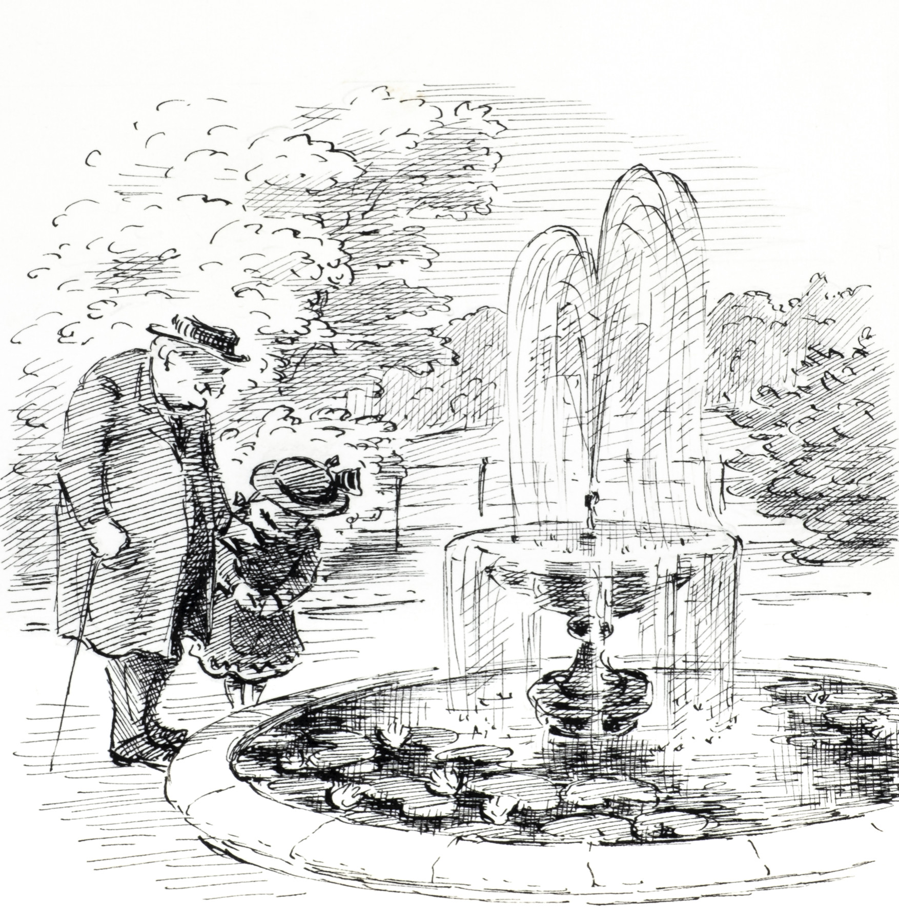 A fountain splashed into a pool on which lilies bloomed and goldfish swam in the clear green water