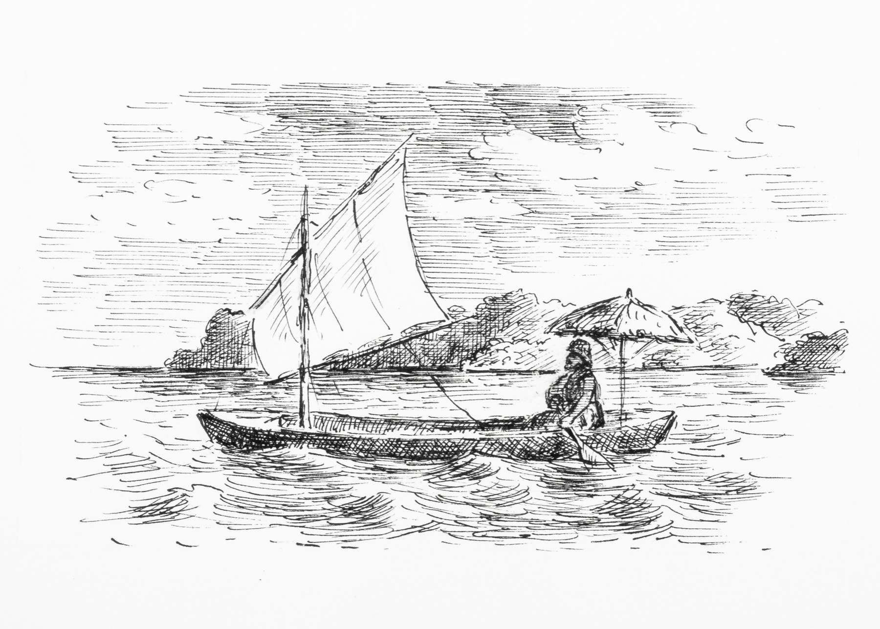 Having fitted my mast and sail, and tried the boat, I found she would sail very well ... I fixed my umbrella also in a step at the stern like a mast, to stand over my head, and keep the heat of the sun off me, like an awning; and thus I now and then took a little voyage upon the sea.