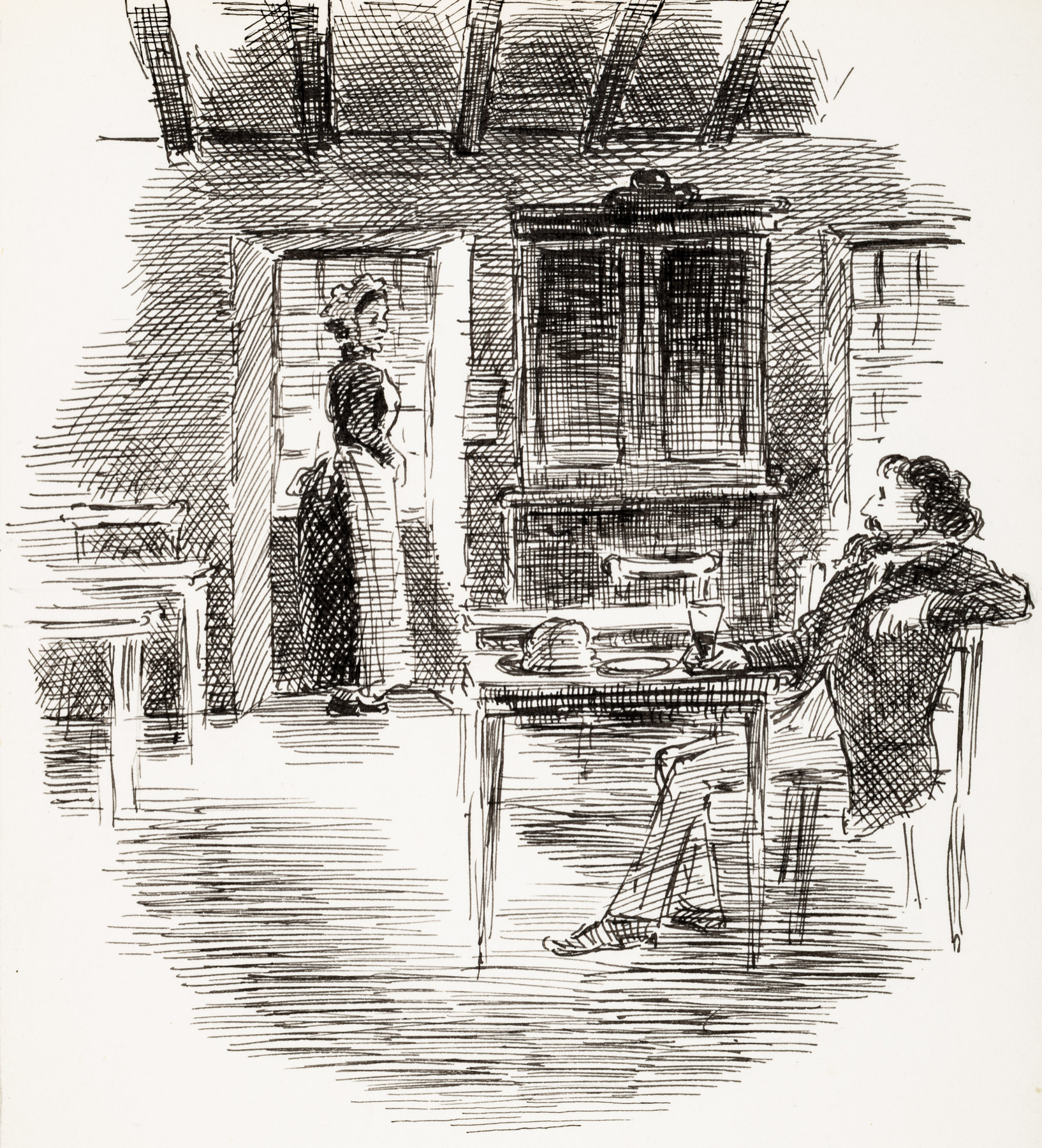 'While I drank, I tried to make her talk. 'You don't often have people here, do you?' , 'No, monsieur, never a soul!’, page 175