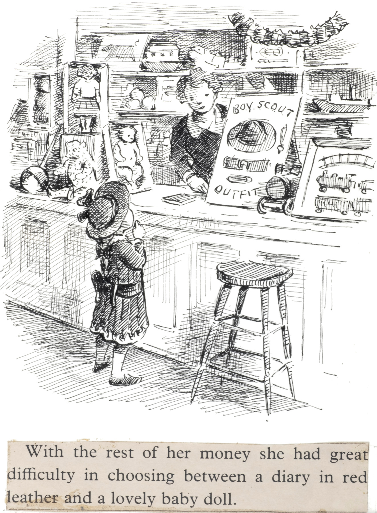 With the rest of her money she had great difficulty in choosing between a diary in red leather and a lovely baby doll