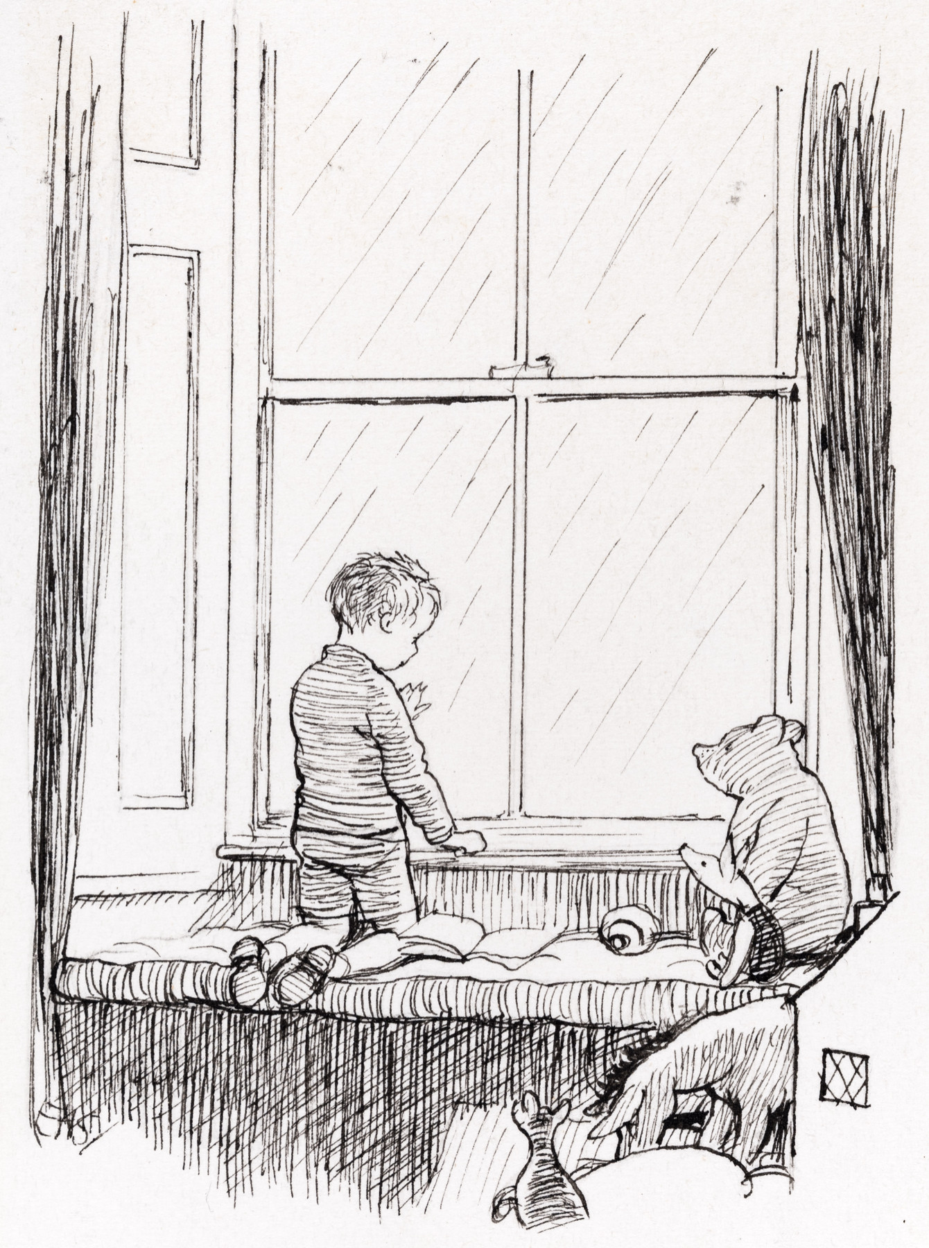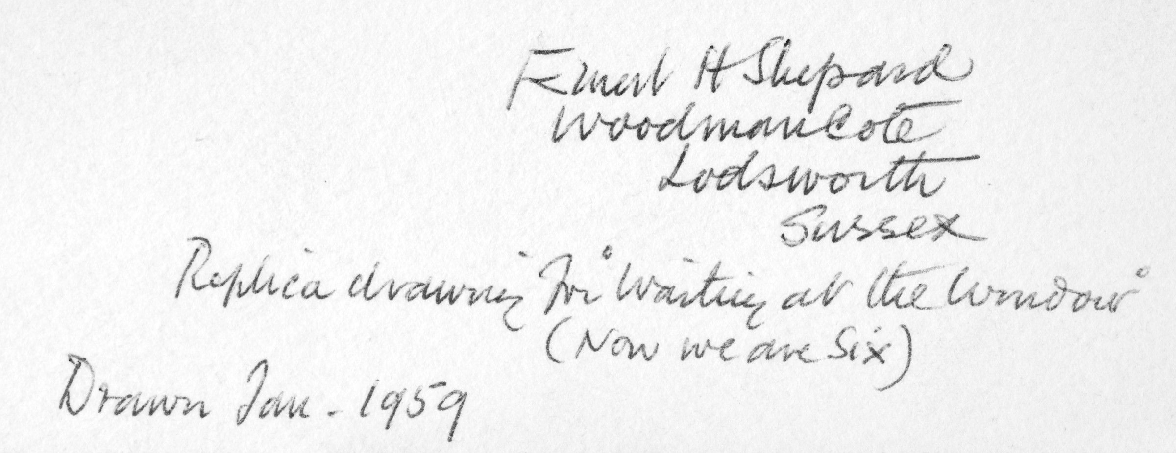 Signed with initials Inscribed with title and 'p 88 N.W.A.S' below mount Signed, inscribed 'Woodmancote Lodsworth Sussex' and 'Replica drawing for Waiting at the Window (Now we are Six)' and dated 'Drawn Jan 1959' on reverse
