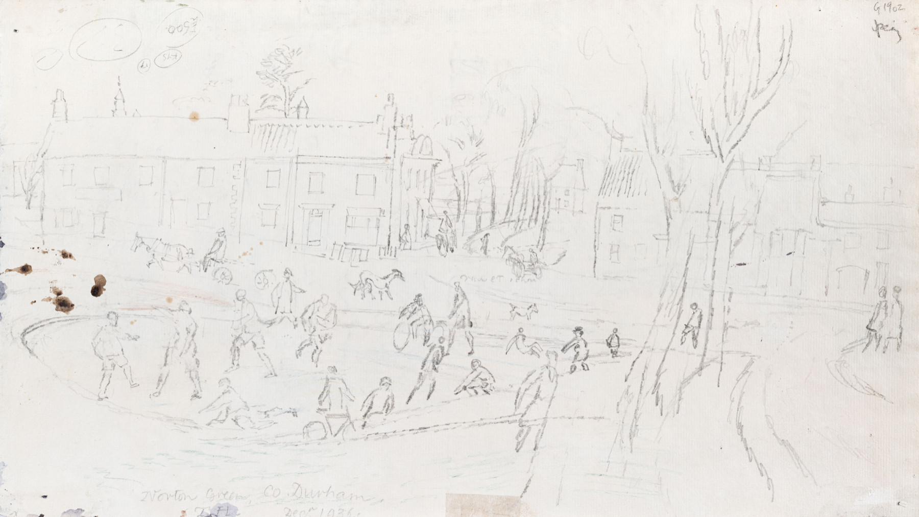 Signed and dated 1942 A pencil drawing of people playing in a village, signed with initials, inscribed 'Norton Green, Co Durham' and dated 'Decr 1936' on reverse