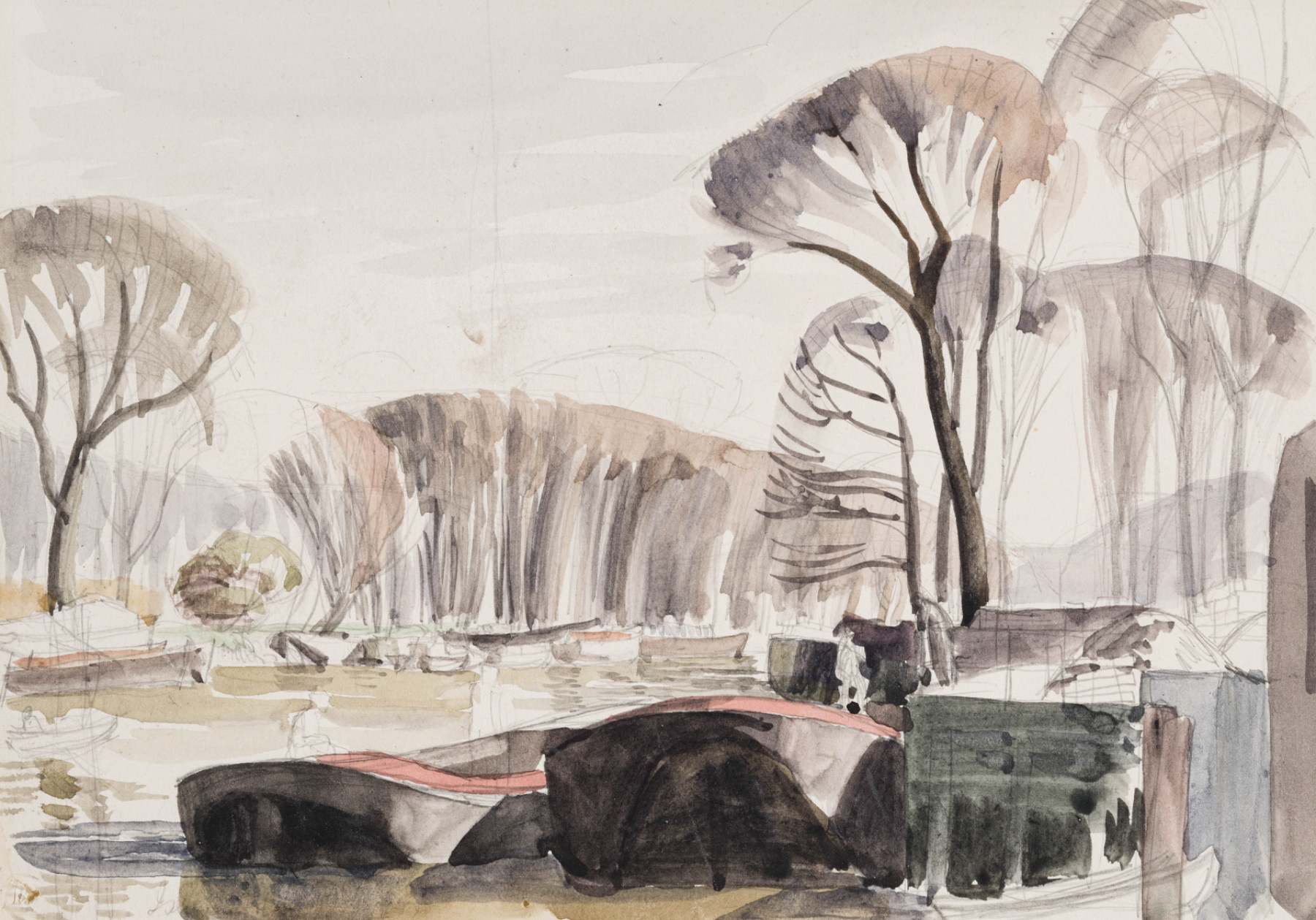 Preliminary drawing for 'Isleworth', exhibited at the Royal Society of Painters in Water-colours, Summer 1934, no 98 and now in the collection of the Walker Art Gallery, Liverpool