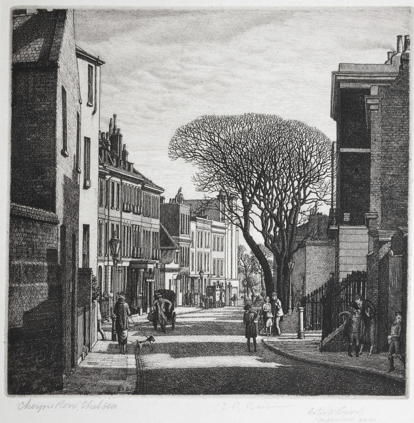Catalogue Raisonné no: 38 From an edition of 50 Executed in 1935 and published by the Fine Art Society. This view is looking down Cheyne Row towards the Thames from Glebe Place, by the junction with Upper Cheyne Row.
