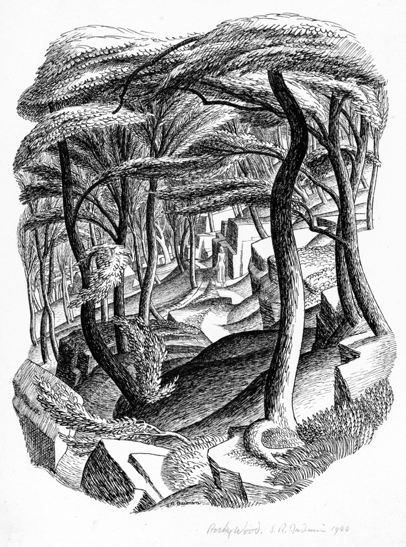 This image is similar to 'Yorkshire Wood', 1936, illustrated in Chris Beetles, S R Badmin and the English Landscape, London: Collins, 1985, page 40.