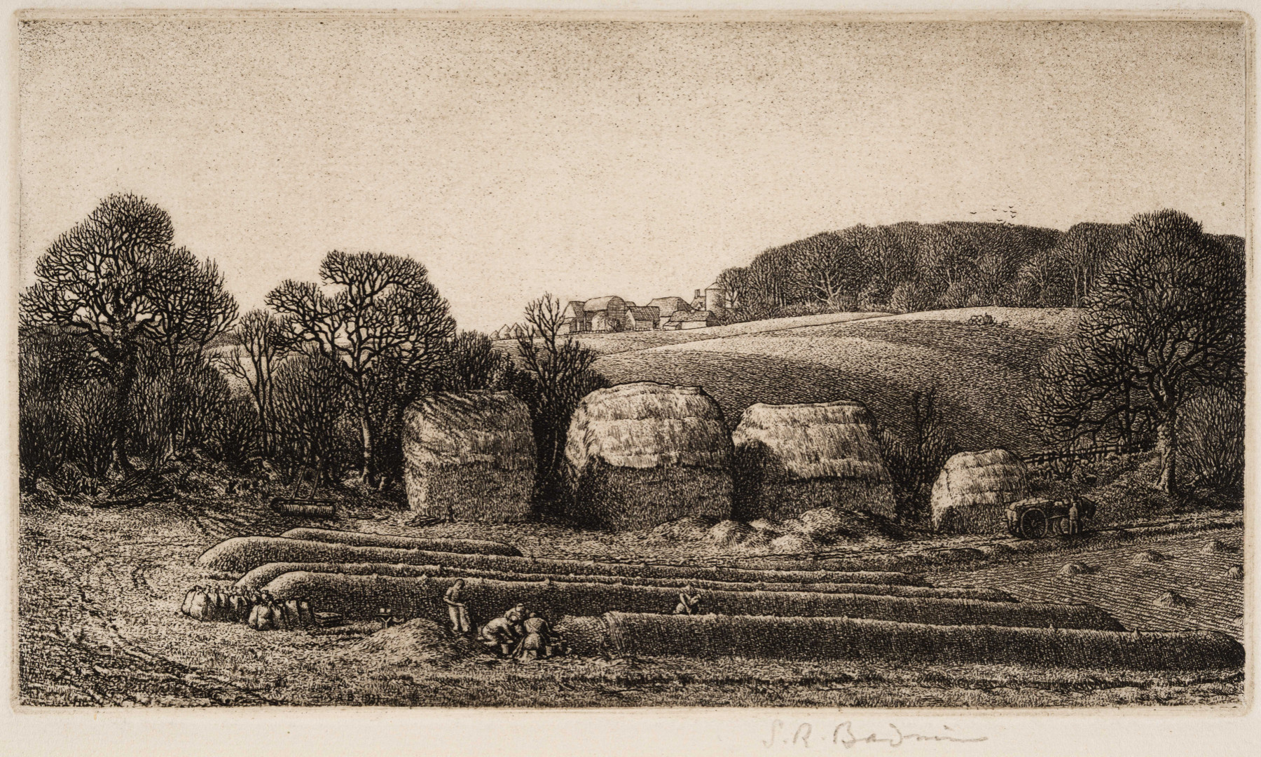 Published by theyTwenty-One Galleru in 1931. Also known as 'Sortying Potatoes', Keston, Biggin Hill, Kent. 'You can see the straw ventilation going up, covered with earth, like little chimneys' (SRB).