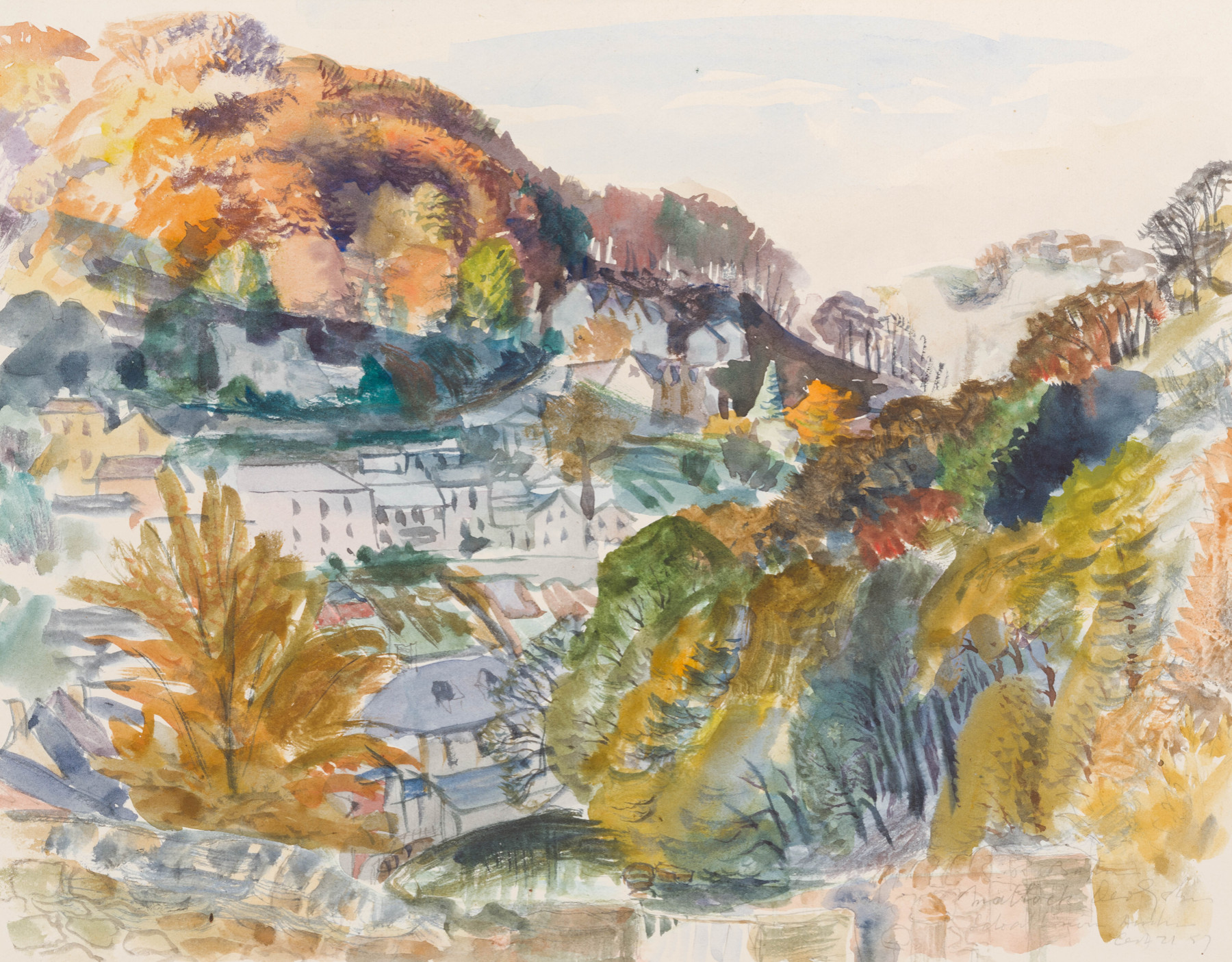 Preliminary drawing for the 1962 finished watercolour Matlock Bank on an Autumn Afternoon.
