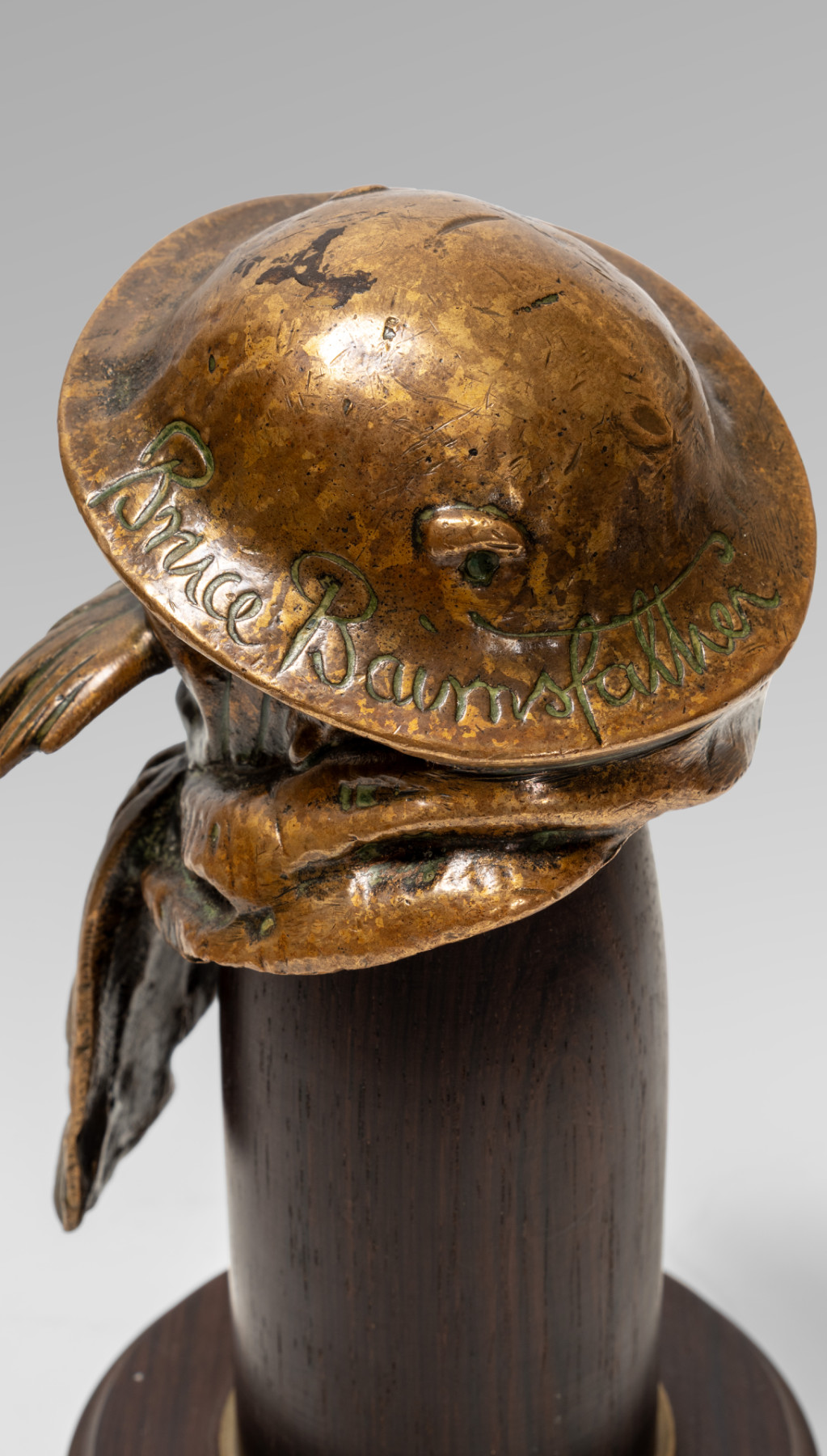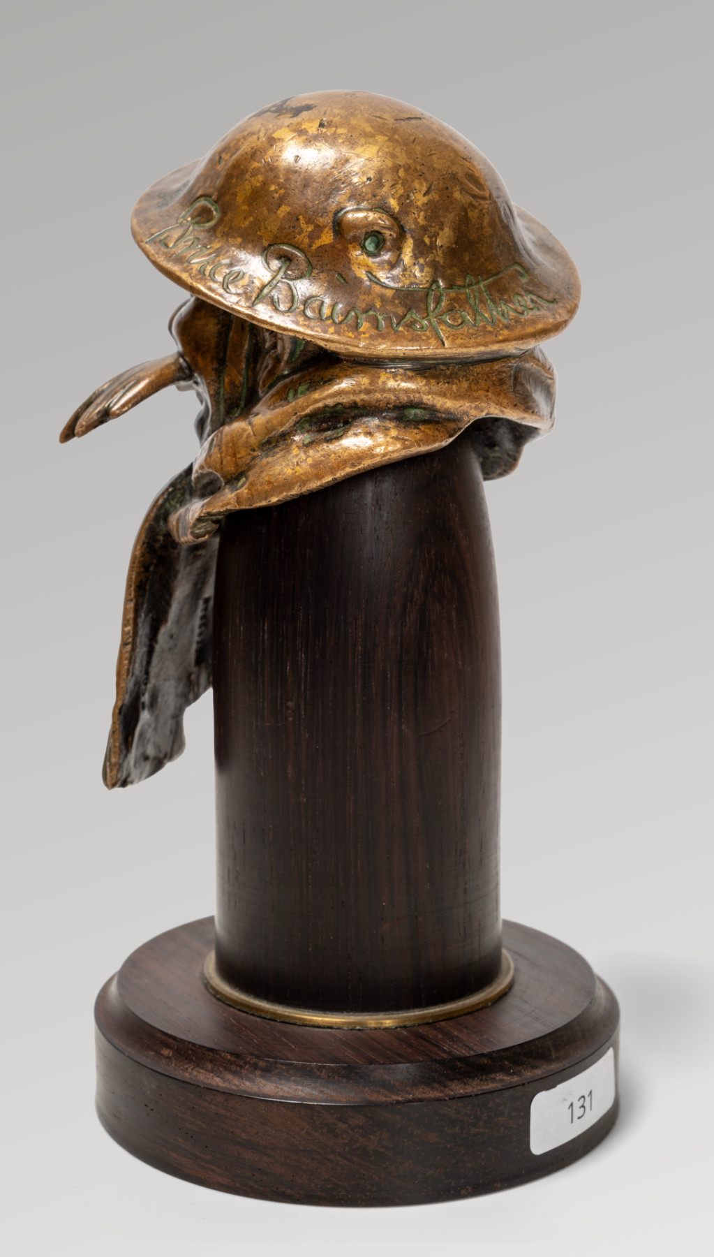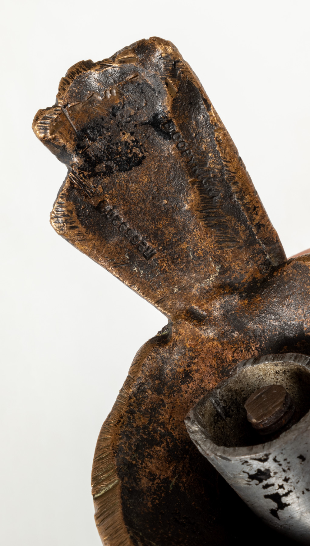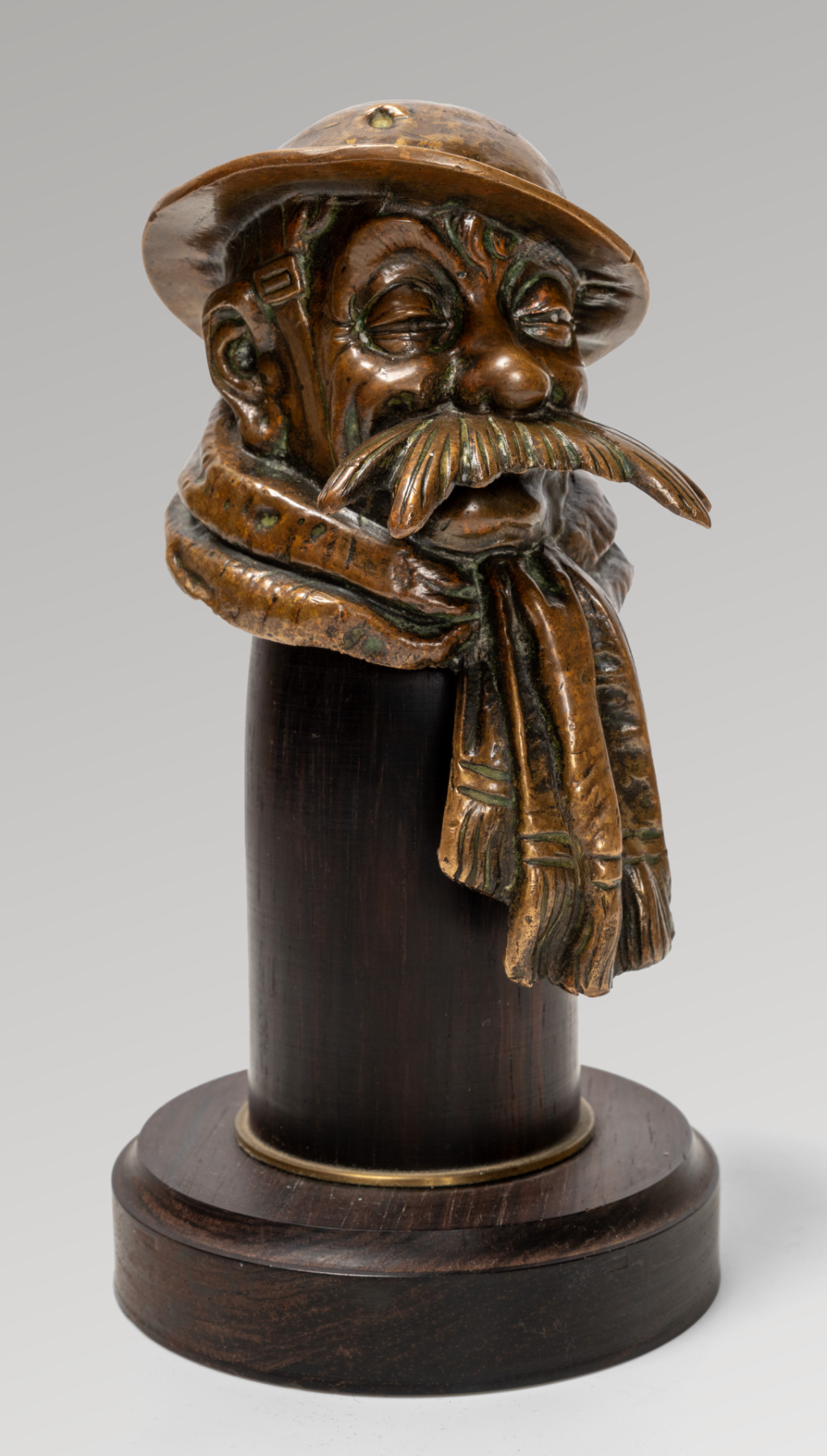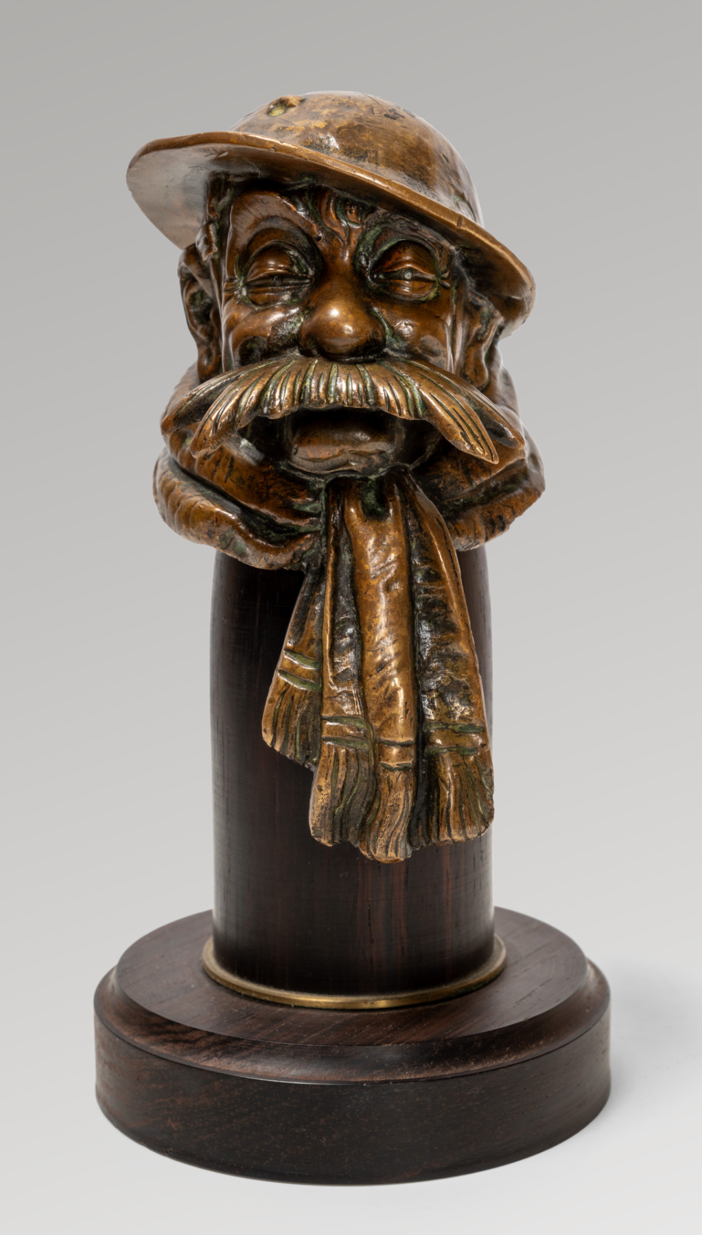 Car mascots such as these were manufactured in bronze and sold exclusively through Smith & Sons of Portland St, London. Hood ornaments were typically used as signifiers of wealth and luxury for particular brands, but were also used to personalise a vehicle. Later, they became increasingly popular as collectible art objects. On this original mascot you can find the registered design numbers stamped underneath his scarf, and it has been mounted onto a wooden base, rather than the hood of a car, for display.