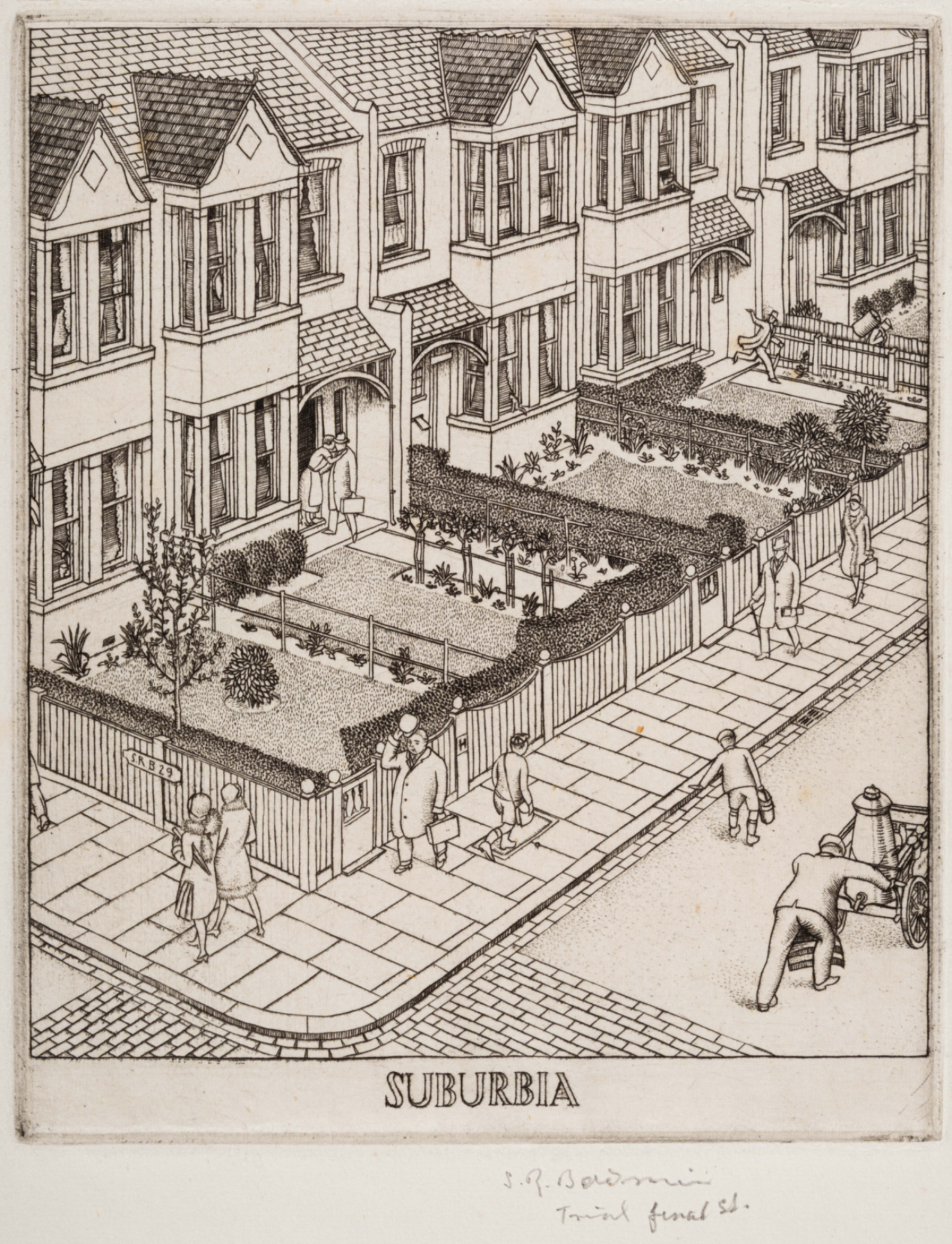 Executed in 1929 and published by the Twenty-One Gallery. Based on Girton & Tansfield Roads Sydenham SE 26. SRB lived at 33 Girton when he was eighteen.