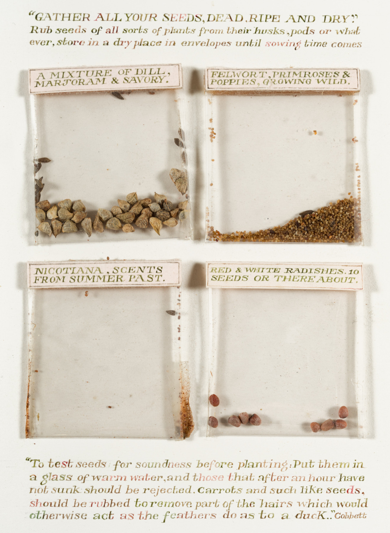 Watercolour with seed packets and seeds affixed