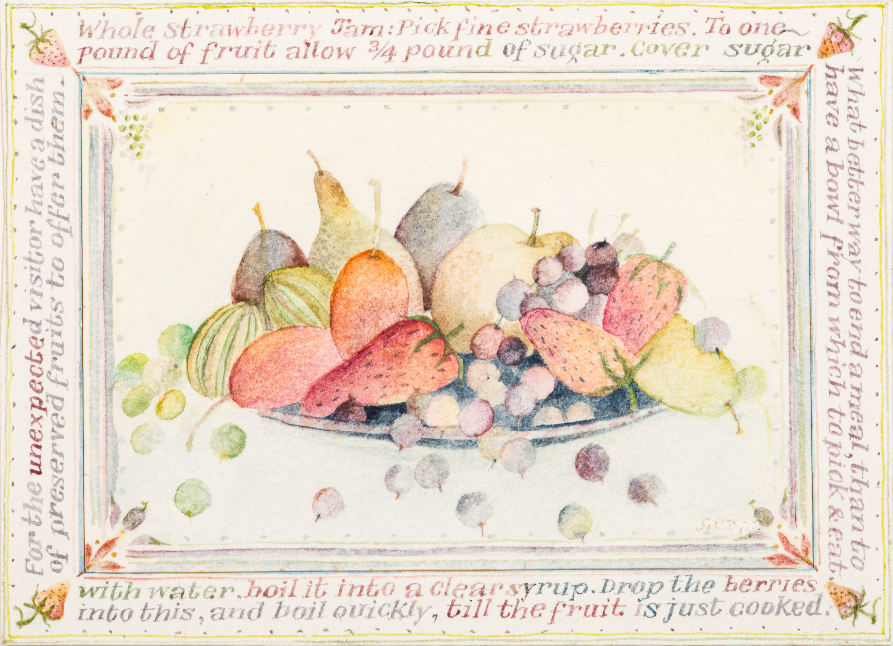 This artwork from Sara's debut book In and Out of the Garden (1981) is the perfect reminder to enjoy seasonal fruits toward the end of the year. Sara's early work illustrates the beauty of the garden throughout all seasons, and emphasises natures importance to our well being. Painted in her signature miniature style, they make our mouths water for both the fruit and illustration.