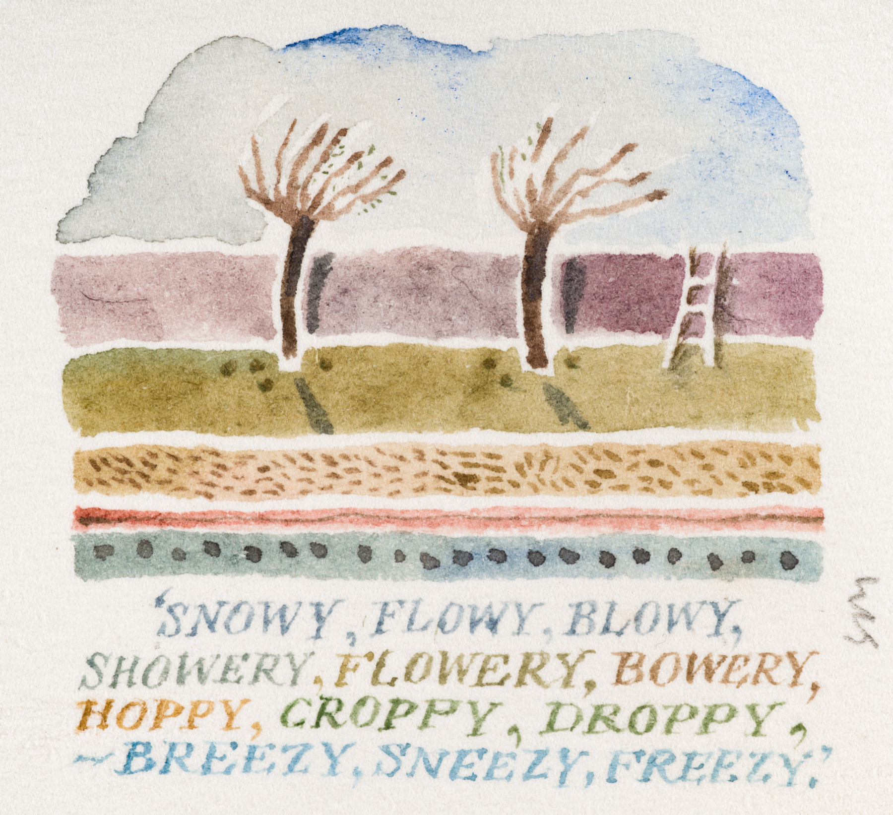 Snowy, Flowy, Blowy, Showery, Flowery, Bowery, Hoppy, Croppy, Droppy, – Breezy, Sneezy, Freezy