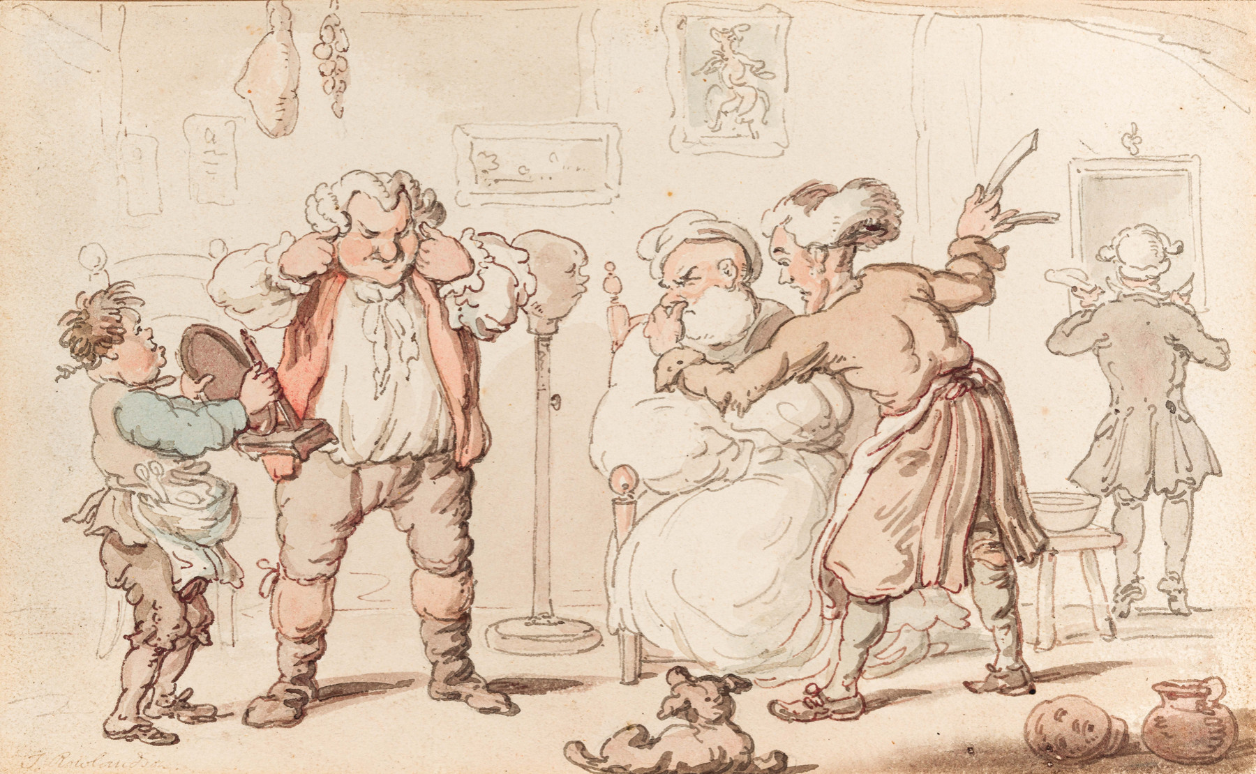 In the later years of his career, Thomas Rowlandson often produced copies and redraws of his most popular images and prints. The present image of a barber shop is likely to be one of those redraws based off an earlier print. There is a similar drawing to his image in the collection of the Achenbach Foundation in San Francisco.