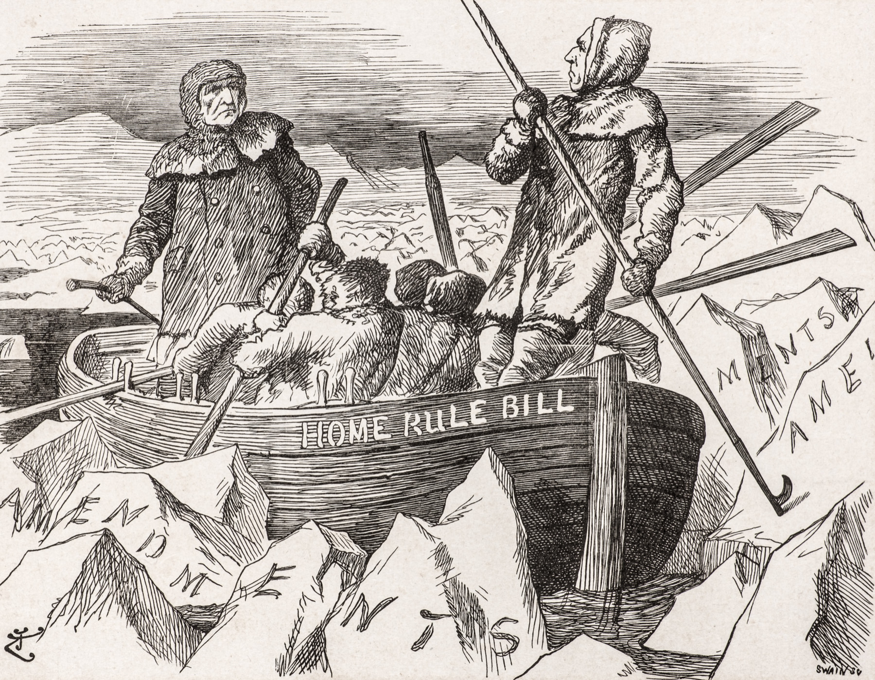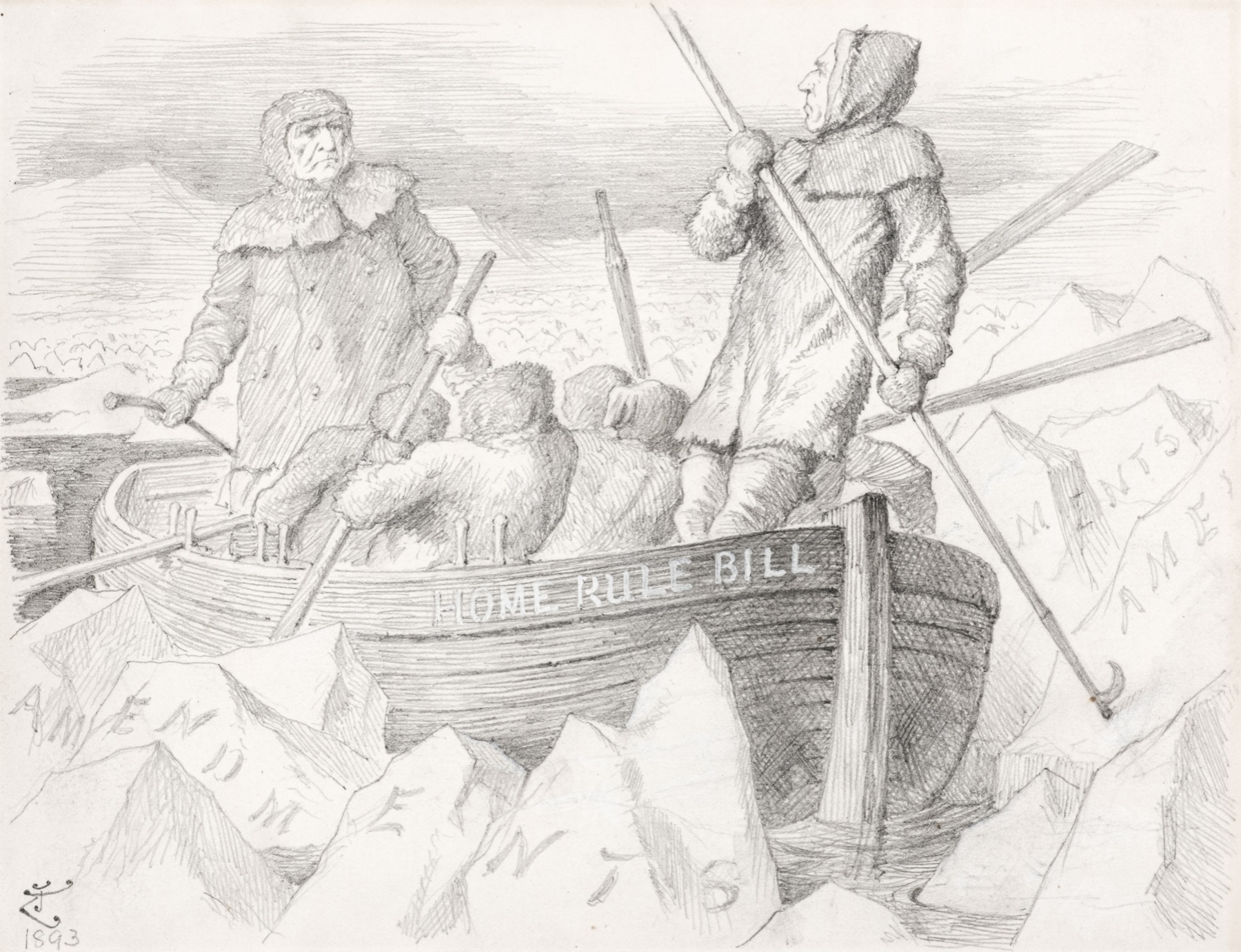 Sir John Tenniel’s cartoon portrays William Gladstone and the Secretary of State for Ireland John Morley navigating a small row boat, representing the Home Rule Bill, through a treacherous ice field of amendments. The inspiration for this cartoon likely came from a ground-breaking Arctic expedition that had set sail in June 1893. The Norwegian explorer Fridtjof Nansen had embarked to the North Pole aboard his ship, the Fram, with the primary goal of intentionally freezing the Fram into the Arctic ice pack and drifting towards the North Pole. By September, it had been successfully frozen into the ice pack, where it drifted for nearly three years. Though the crew were unable to reach the North Pole due to bad weather in 1895, the expedition significantly increased understanding of the Arctic Ocean and patterns of ice movement.