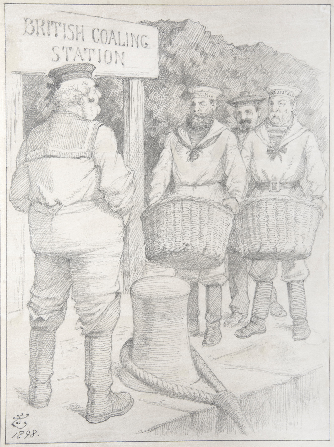 In the late 19th century, British coal, particularly from South Wales, was exported for use in the shipping industry across Europe. In Tenniel’s cartoon, John Bull, the representation of Great Britain, addresses the nations of Russia, Germany and France, who have arrived for their share of British coal. John Bull’s sotto voce comment suggests at the scepticism felt in Britain at the time towards sending coal to Britain’s industrial and military rivals.