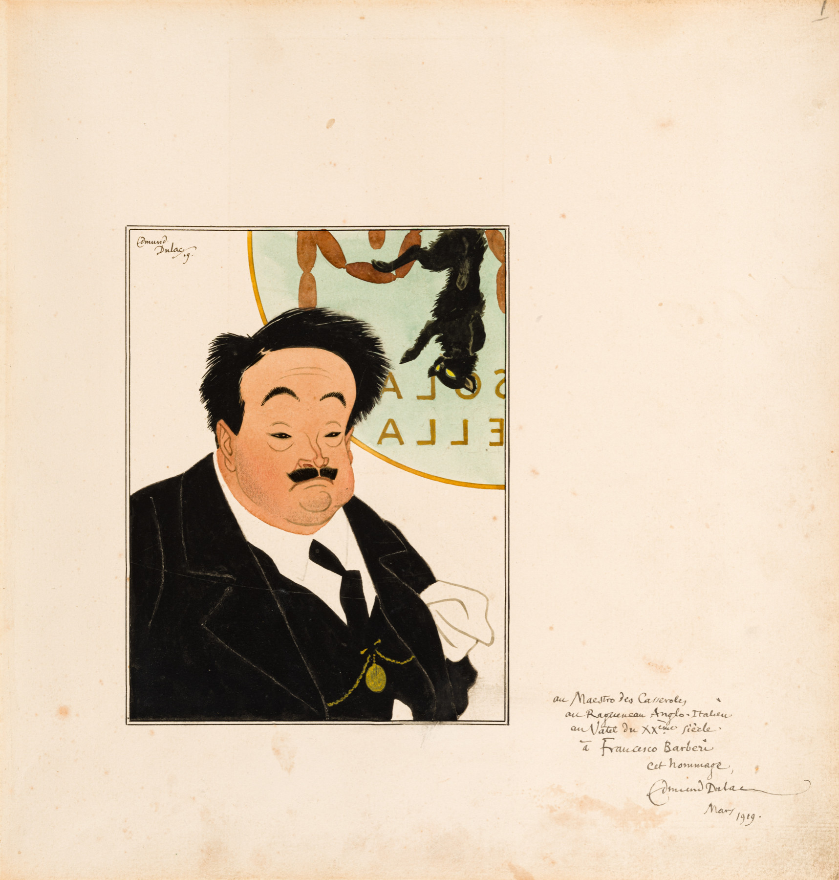 Signed and dated 19 Signed, inscribed 'au Maestro des Casseroles, au Ragueneau Anglo-Italian, au Natel du XXème Siècle, à Francesco Barberi cet hommage' and dated 'Mars 1919' below mount Signed on reverse