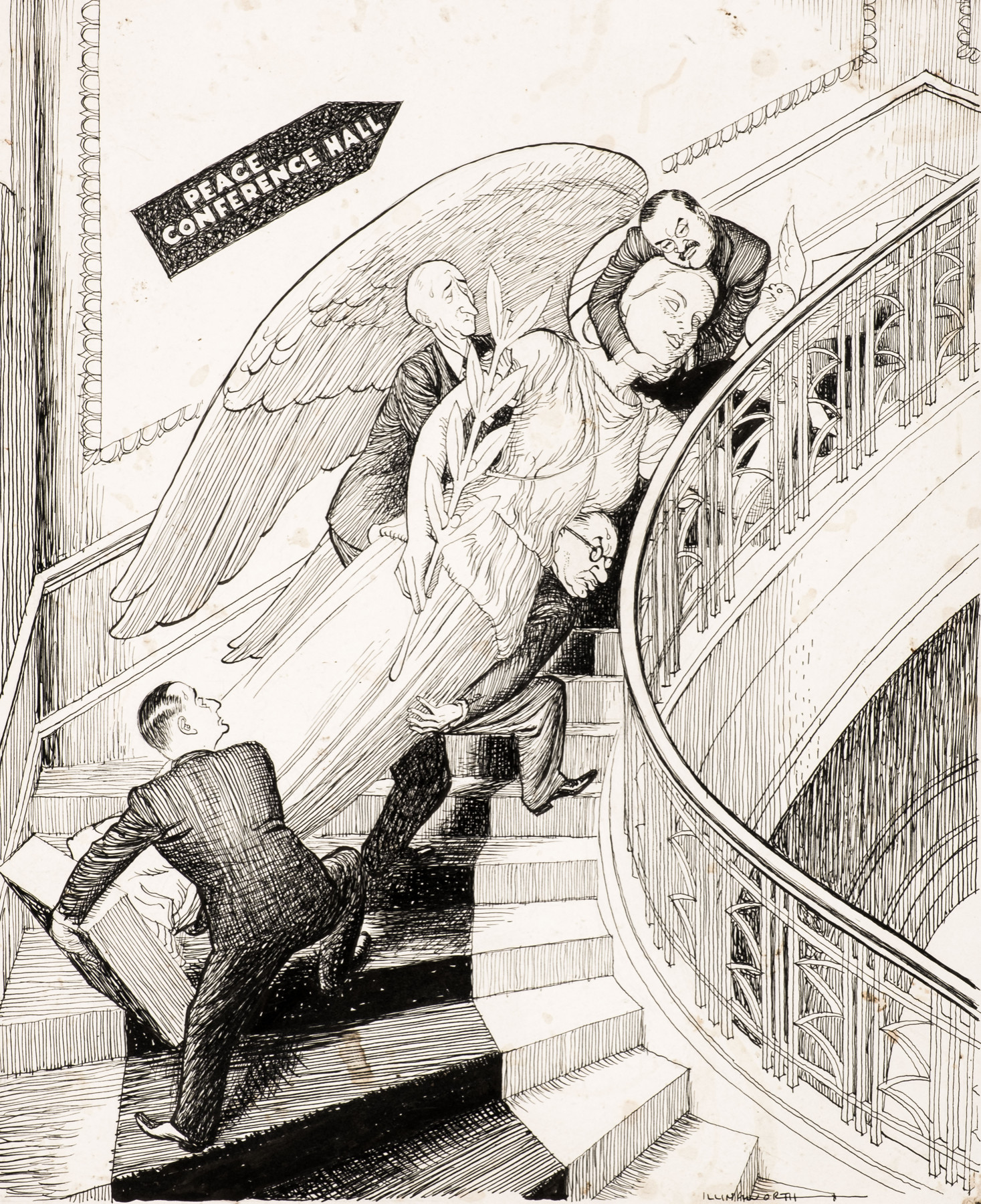 Leslie Illingworth strikes a cautiously optimistic tone, suggesting a hope that lasting peace can be achieved, but that it will not be an easy negotiation, represented by the manoeuvring of the statue of ‘Irene’ (a play on Eirene, the Greek Goddess of Peace), around a tricky staircase. He depicts the representatives of the United Kingdom, Soviet Union, United States and France as those tasked with the difficult task. Those representatives were Ernest Bevin, the British Secretary of State; Viacheslav Molotov, the Minister of Foreign Affairs of the Soviet Union; Georges Bidault, Prime Minster of France and Chair of the Provisional Government of the French Republic; and James F Byrnes, the United States Secretary of State.