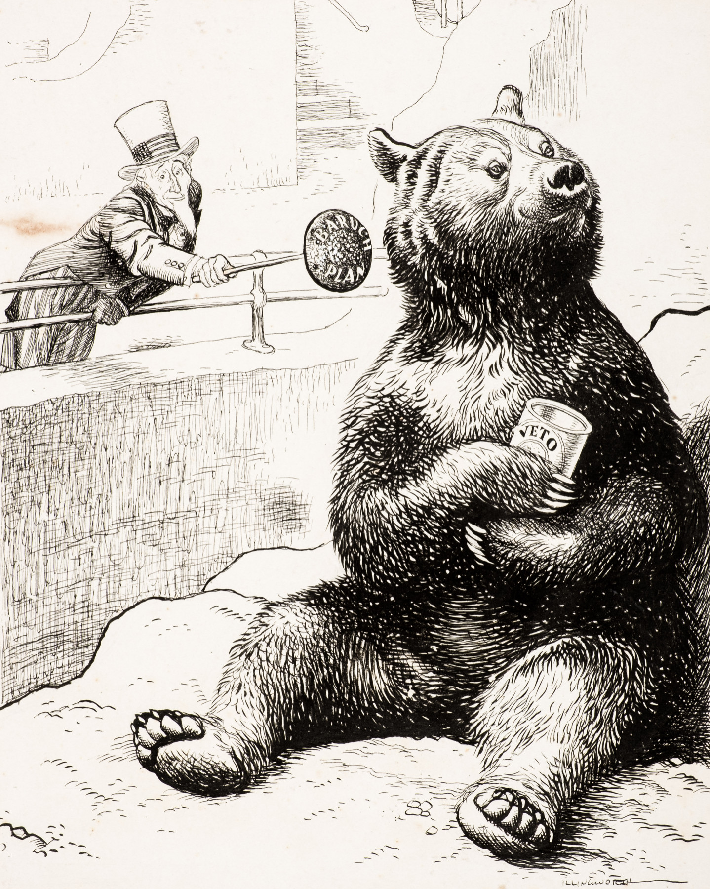 In Leslie Illingworth’s cartoon, Uncle Sam tries unsuccessfully to tempt the Russian bear with the Baruch Plan, with the representation of Russia still clutching its veto.
