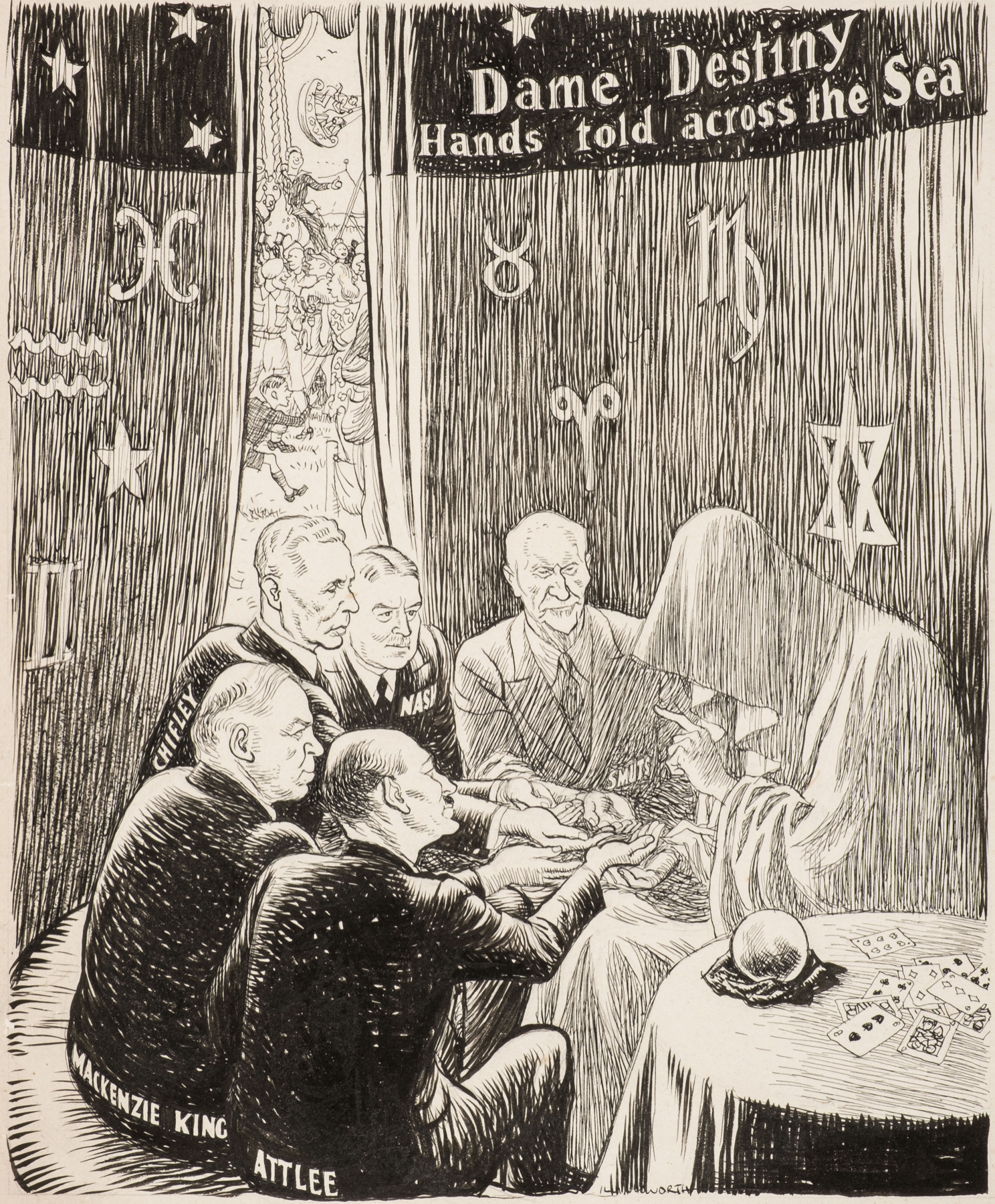 The present cartoon was published a few months before start of the Imperial Conference, which was held in London in August 1946. Due to the War, it was the first such meeting since 1937. Leslie Illingworth appears hopeful that the Conference will demonstrate the continued need for friendship and cooperation between members of the Commonwealth in the post-war era. Those featured in the cartoon having their palms read are the British Prime Minister Clement Attlee, the Australian Prime Minister Ben Chifley, the New Zealand Minister of Finance Walter Nash, Prime Minister of Canada William Lyon Mackenzie King, and the Prime Minster of the Union of South Africa Jan Smuts.