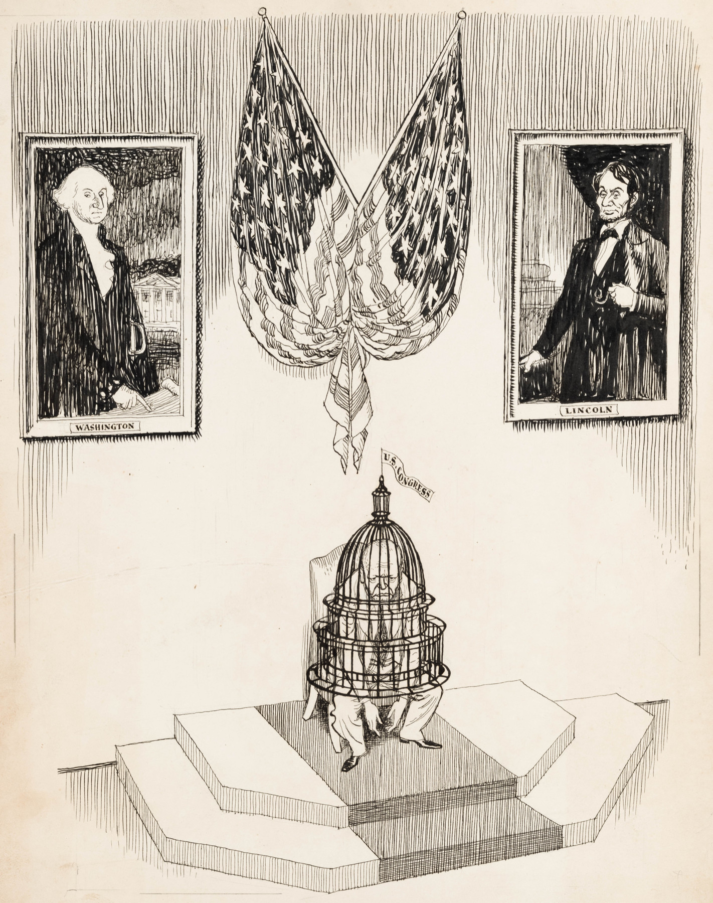 The present cartoon was published just over a week after the US midterm elections on 2 November 1954. As a result of the midterm elections, the Democratic Party had regained control of both the House of Representatives and the Senate. In the first two years of his term, Eisenhower had been able to pass much of his moderate Republican agenda, including measures on defence, foreign aid and economic policy. The result of the midterms restricted Eisenhower’s ability to advance his domestic programme and forced him to compromise more frequently. Leslie Illingworth portrays the President as miserable and restricted by the ‘cage’ of the Democrat-controlled Congress.
