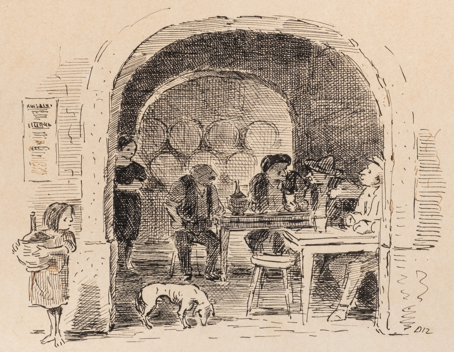 Designed and produced by John Lewis, and published by John Harvey and Sons Ltd of Bristol in 1962, the ‘Harveys Wine List Second Edition 1962-1963’, is an 88-page wrapper-bound catalog containing twenty-five in-text drawings created by Ardizzone, with accompanying literary excerpts, quoted as captions, plus four smaller ancillary decorative drawings from the rear cover design.