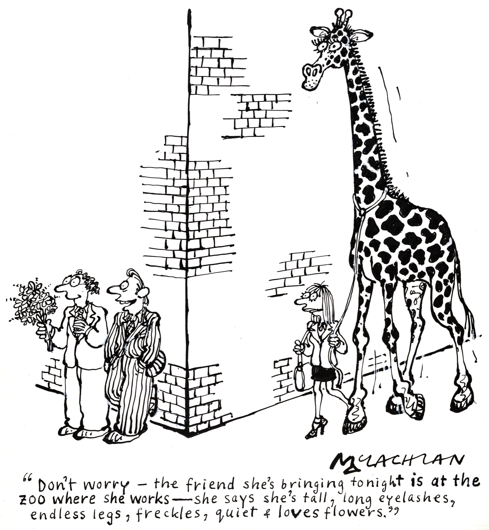 Don't worry – the friend she's bringing tonight is at the zoo where she works – she says she's tall, long eyelashes, endless legs, freckles, quiet and loves flowers