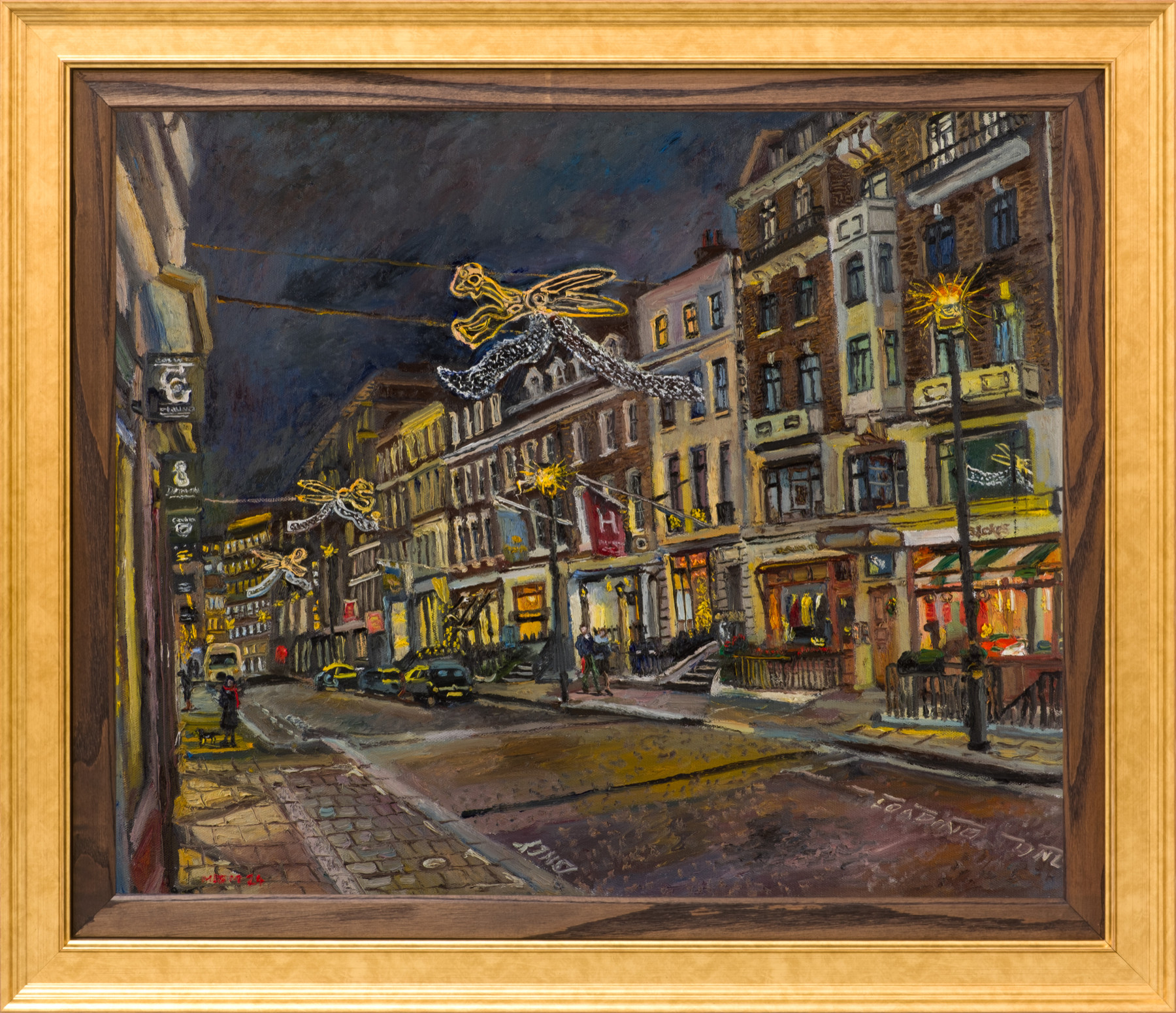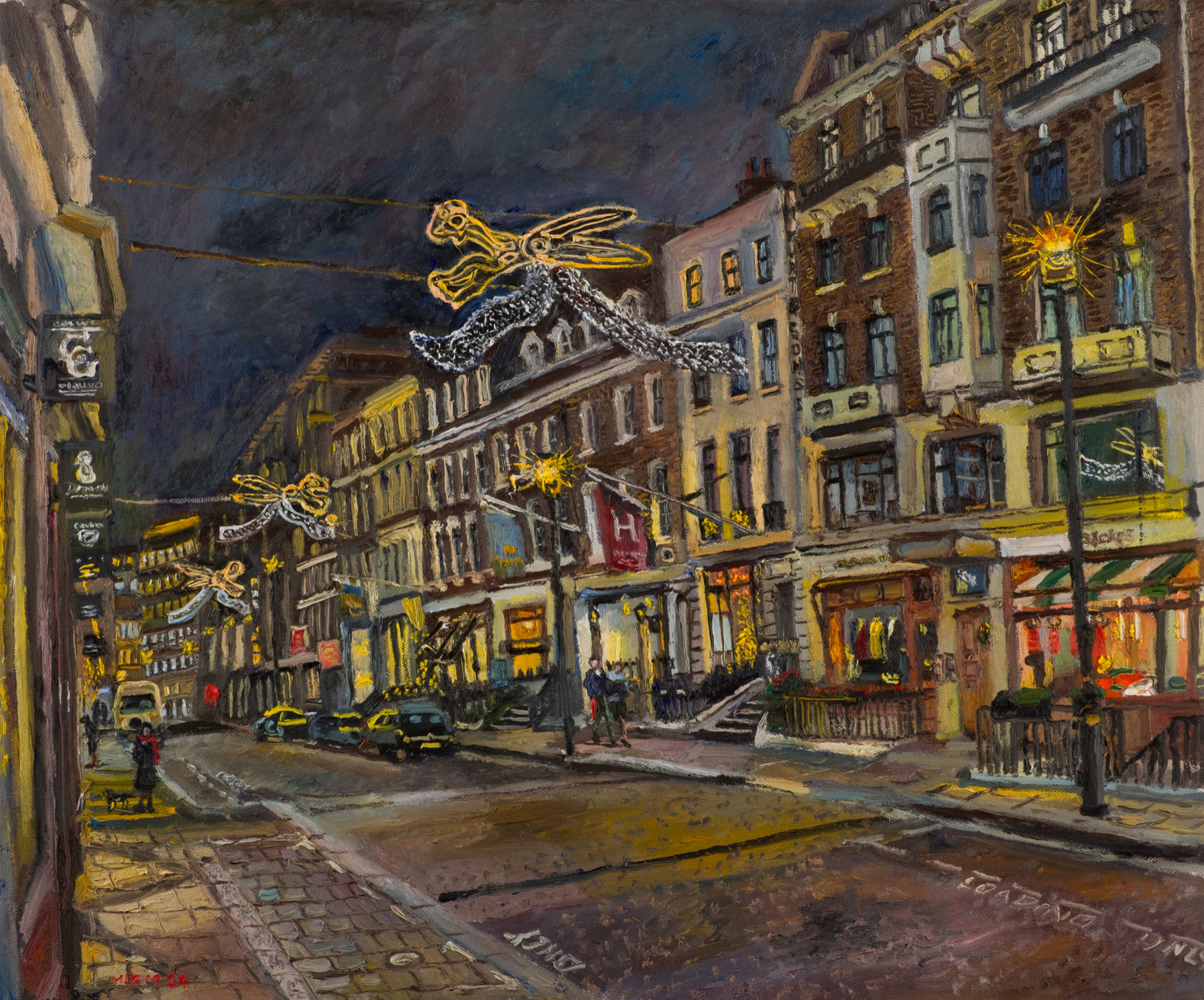 'Merry Christmas! last few nights I’ve been painting in Saville Row, a lot quieter than my previous night time painting, but beautiful lights and a lovely sedate atmosphere in that street. Last year [I did one] of Fortnums, wish I had the energy to do Cartier ... They’re all so good this year!'