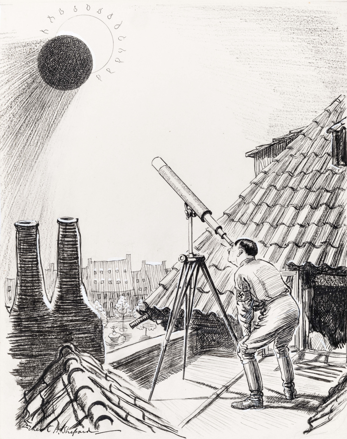 A solar eclipse took place on 19 June 1936 and was observed by expeditions in Kamishari, in North Africa, in North Japan, and Omsk, in Siberia. This is a metaphor for Hitler's imperialistic designs.
