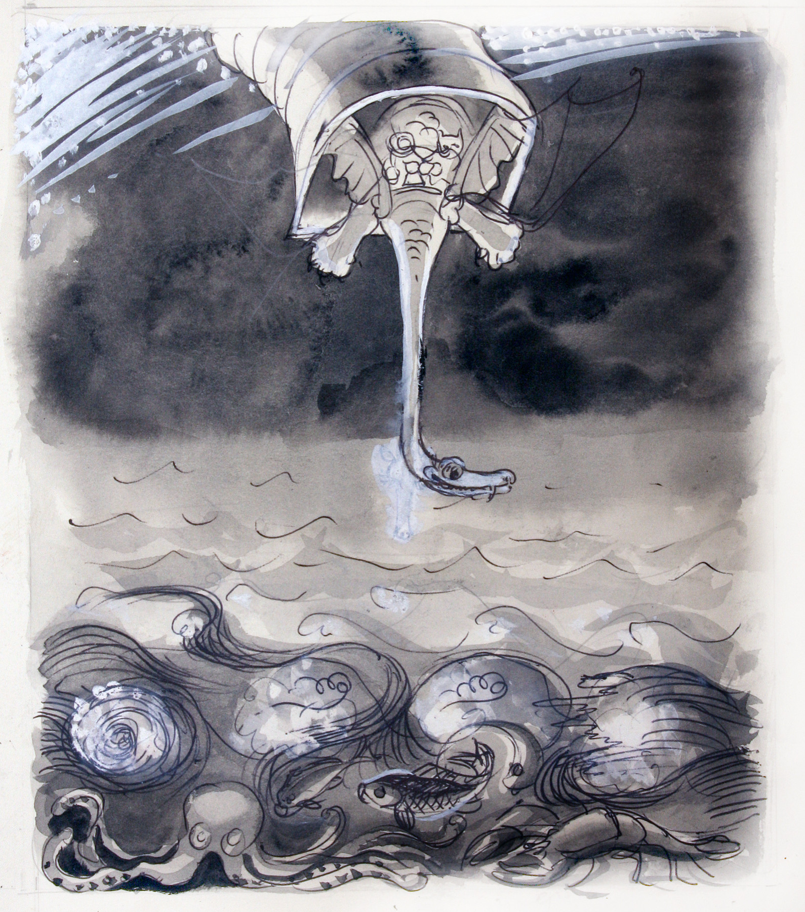Monochrome watercolour with pen ink and bodycolour