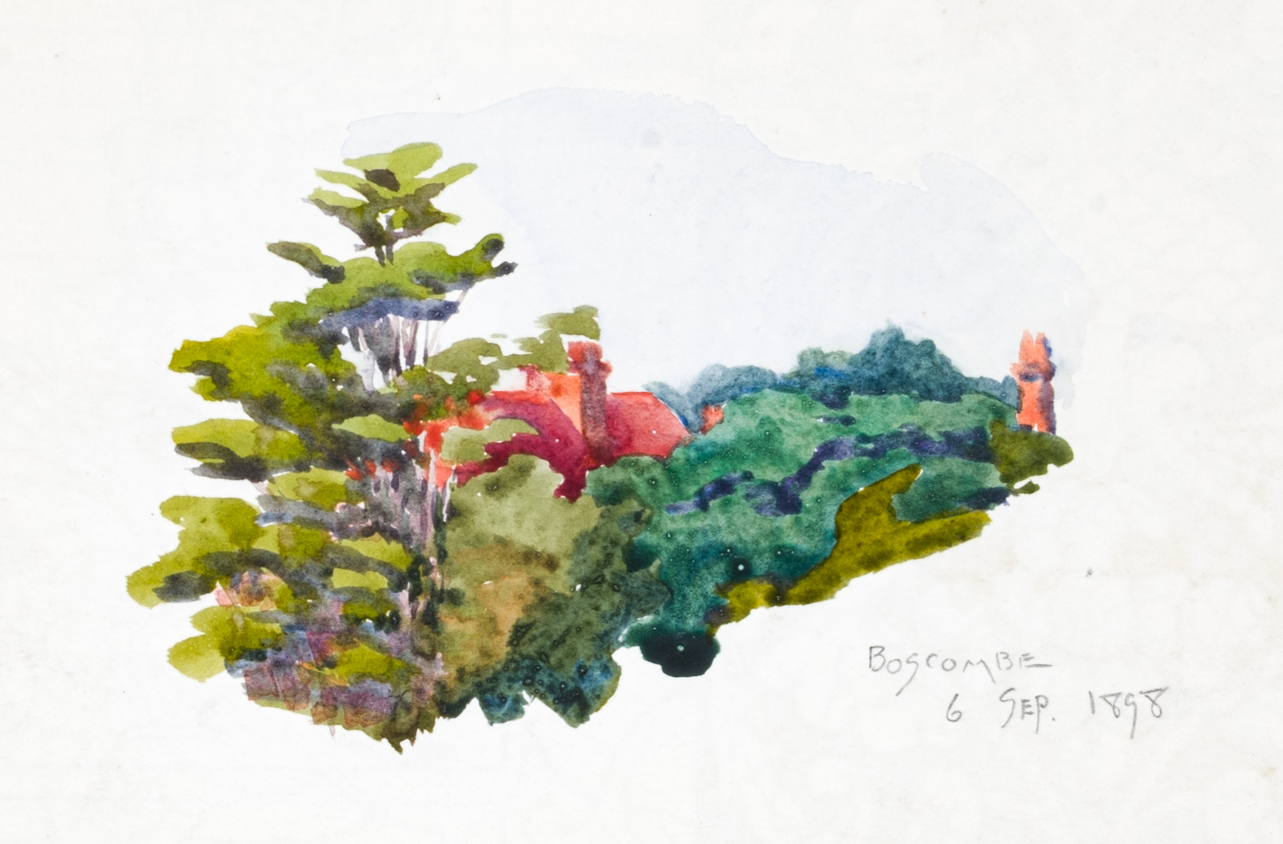 Watercolour drawing of a roof among trees, inscribed 'Boscombe' and dated '6 Sep 1898' on reverse