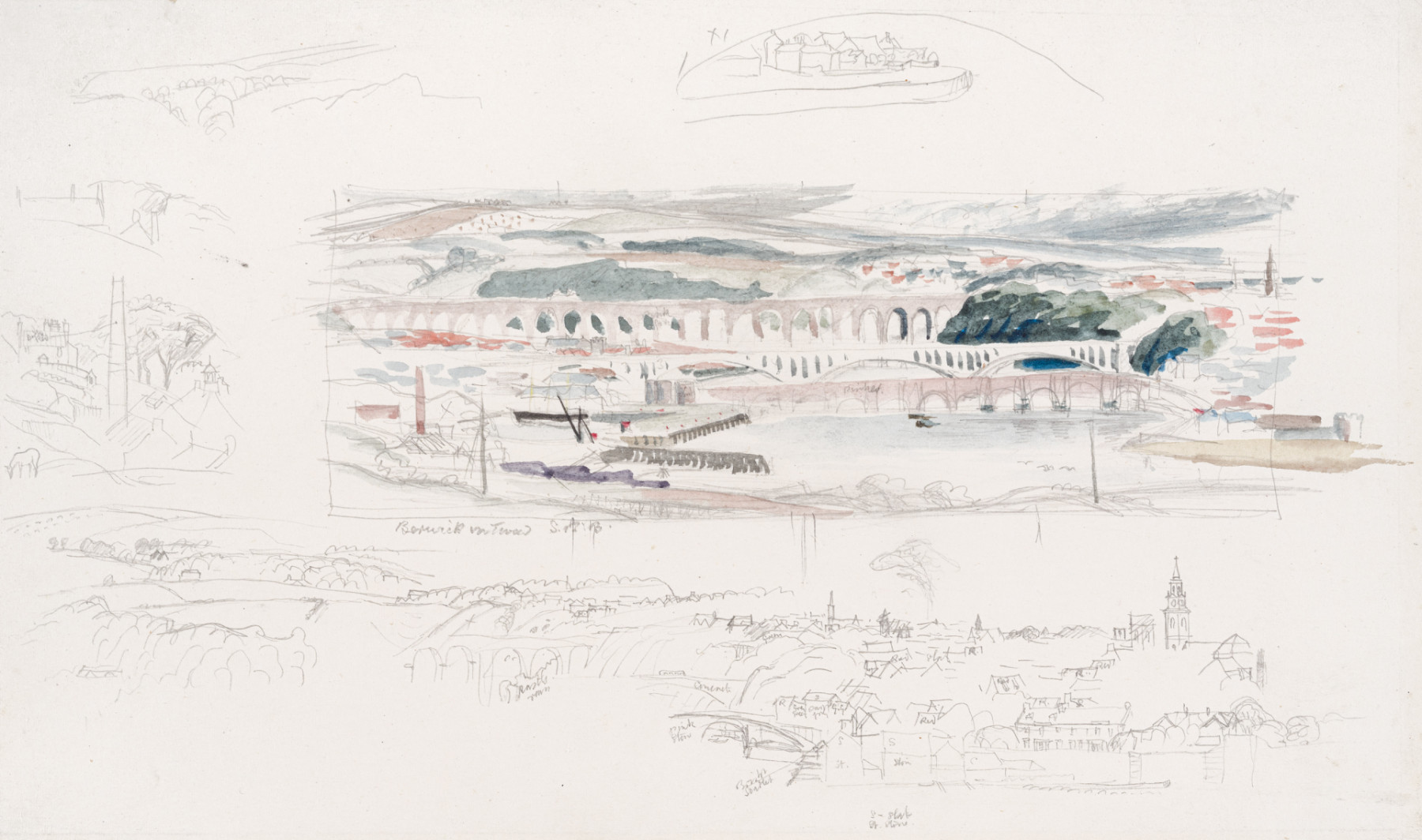 Preliminary drawing for 'Berwick-on-Tweed, Northumberland', a London North Eastern Railway carriage poster, 1945-1947. The finished watercolour was exhibited at ‘S R Badmin, RWS, RE, ARCA, FSIA’, Worthing Art Gallery, November-December 1967, no 36 as 'Bridges over the Tweed' (lent by Dr H G Butterfield);