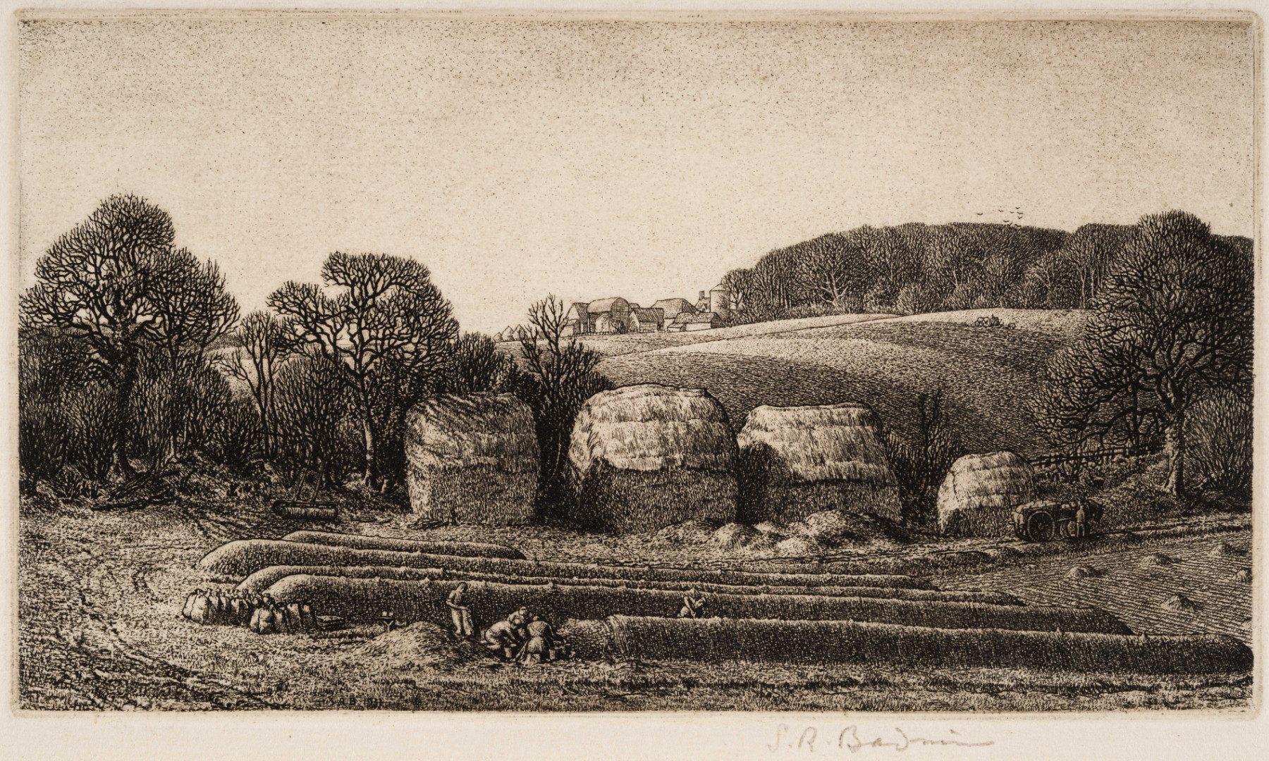 Published by theyTwenty-One Galleru in 1931. Also known as 'Sortying Potatoes', Keston, Biggin Hill, Kent. 'You can see the straw ventilation going up, covered with earth, like little chimneys' (SRB).